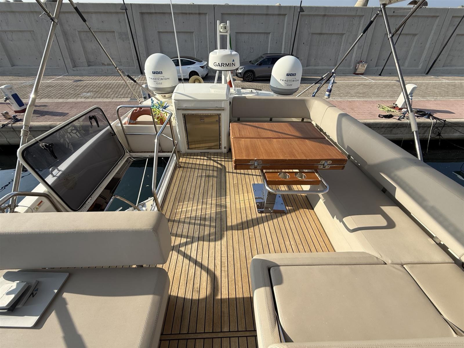 Engine Alarm, Bilge Alarm, Alternator, Water pressure pump, Teak Side Decks, Shore power cable, Deck Shower, Twin Steering, Directional Spotlight, Electric Flaps (HUMPHREE), Fire Extinguishing System, Flaps Indicators, Washbasin in the cockpit, Courtesy Lights, Underwater lights, Gangway, Platform (AFFONDABILE IDRAULICAMENTE), Automatic Bilge Pump, Manual Bilge Pump, Teak deck, Entry door (CON APERTURA FINESTRATURA A COMPASSO), Side door, Teak Cockpit, Shorepower connector, Electronic instrumentation repeater, Rollbar, Electric Windlass, swimming ladder, Saddles for tender, cockpit table, guard rails with gates, Horn, Stern Winches.