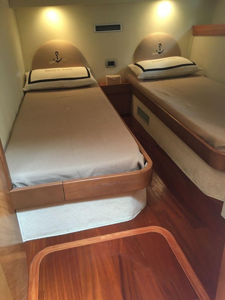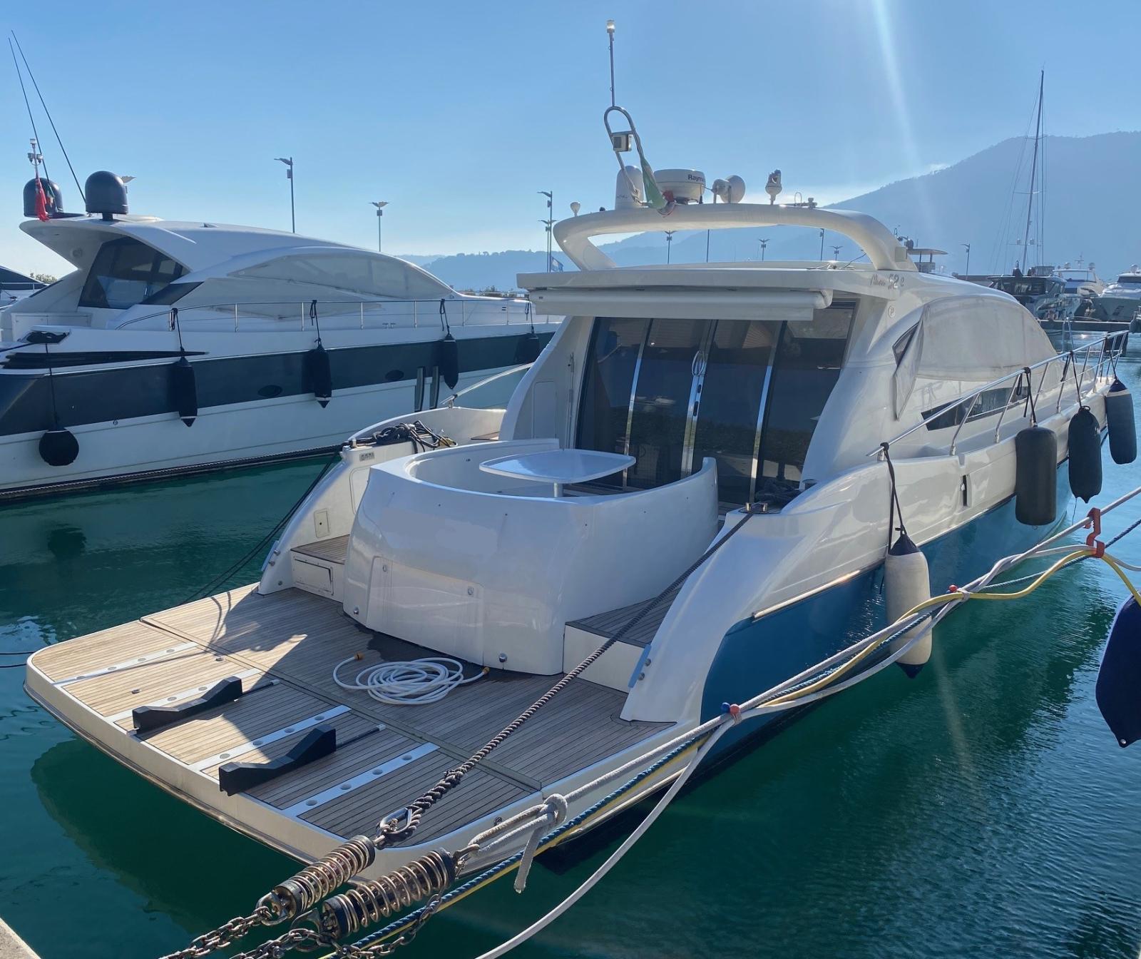 Engine Alarm, Bilge Alarm, Water pressure pump, Special Colour (CARTA ZUCCHERO), Deck Shower, Hydraulic Flaps, Hard top, Fire Extinguishing System, Courtesy Lights, Gangway (IDRAULICA A SCOMPARSA), Platform (IDRAULICA AFFONDABILE), Automatic Bilge Pump, Manual Bilge Pump, Entry door, Teak Cockpit, Shorepower connector, Voltage Rectifier, Rollbar, Electric Windlass, swimming ladder, Saddles for tender, cockpit table (ELETTRICO), Tender, guard rails with gates, Horn, Stern Winches.