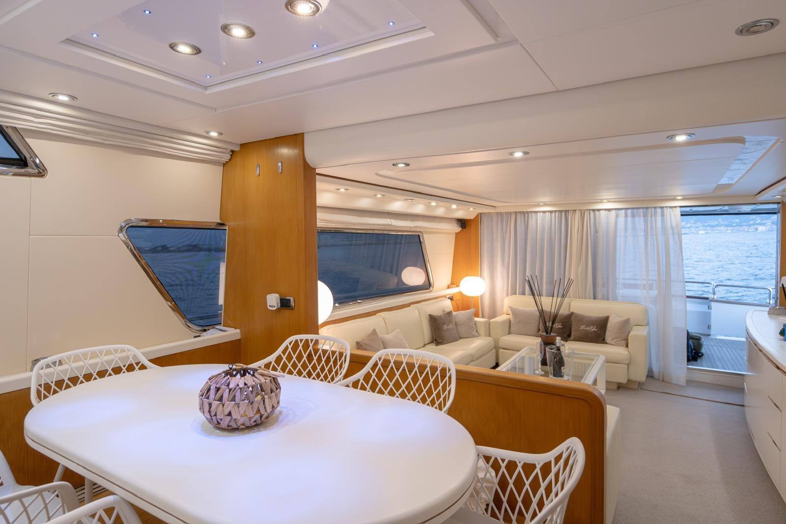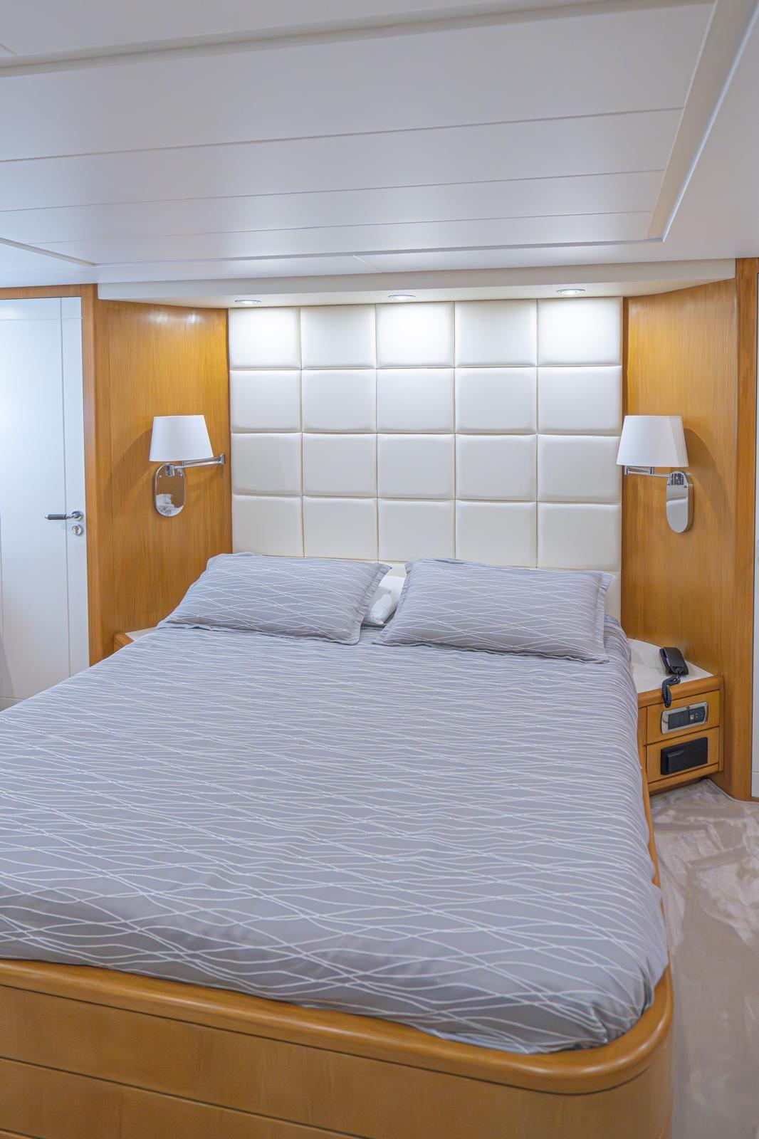 Fume/Gas Detector, Engine Alarm, Bilge Alarm, Water pressure pump, Teak Side Decks, Deck Shower, Twin Steering, Hydraulic Flaps, Crane, Fire Extinguishing System, Flaps Indicators, Anchor Chain Washdown, Courtesy Lights, Gangway, Platform, Automatic Bilge Pump, Manual Bilge Pump, Entry door, Side door, Teak Cockpit, Shorepower connector, Voltage Rectifier, Electronic instrumentation repeater, Rollbar, Electric Windlass, swimming ladder, cockpit table, guard rails with gates, Horn, Stern Winches, Bow Winches.