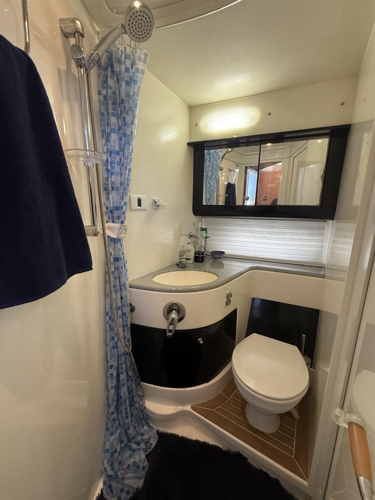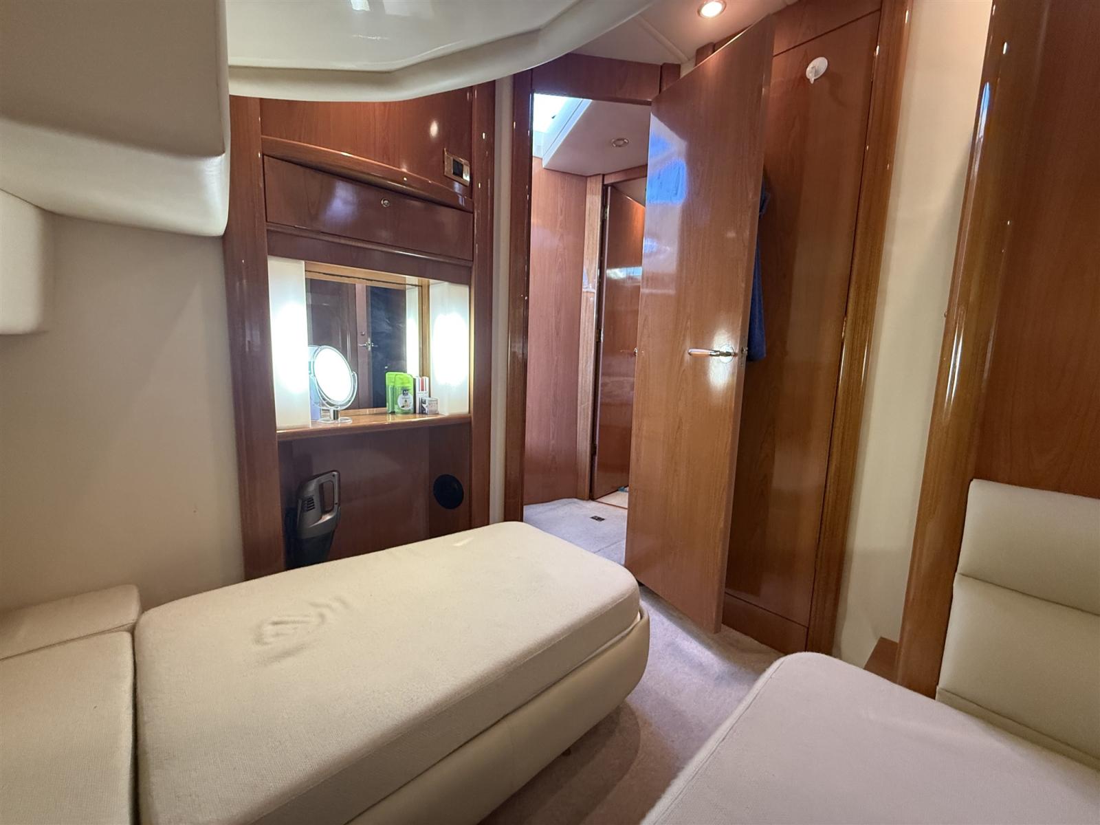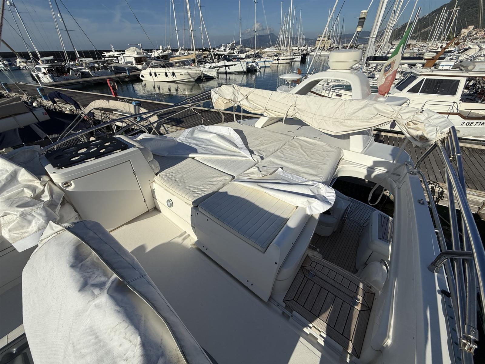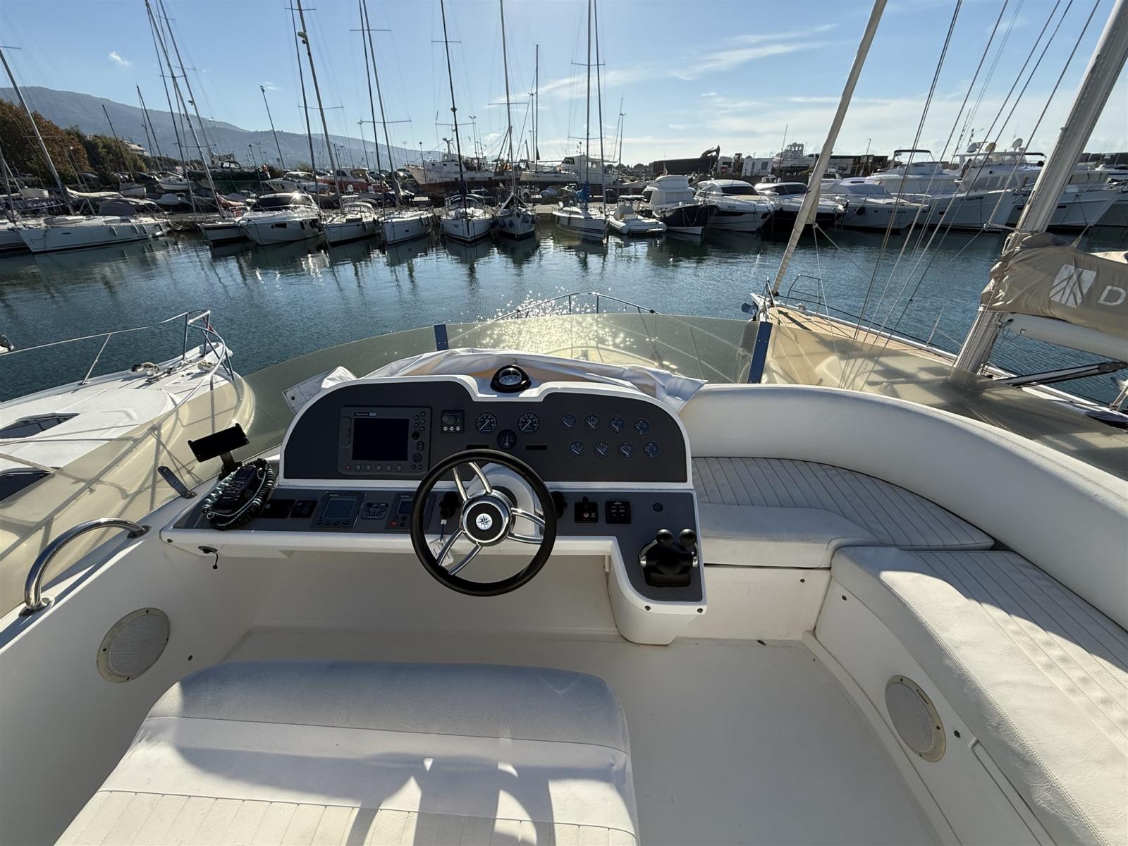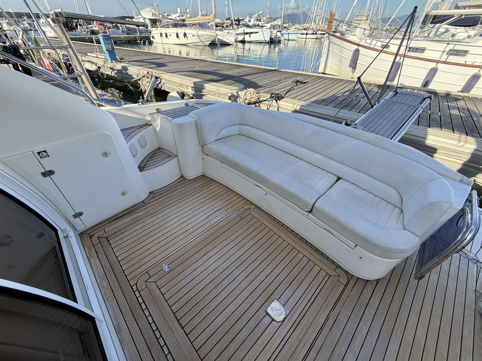 Engine Alarm, Bilge Alarm, Alternator, Water pressure pump, Shore power cable, Guard rail, Deck Shower, Twin Steering, Directional Spotlight, Electric Flaps, Fire Extinguishing System, Flaps Indicators, Washbasin in the cockpit, Courtesy Lights, Underwater lights, Fenders, Gangway, Platform, Automatic Bilge Pump, Manual Bilge Pump, Entry door, Teak Cockpit, Shorepower connector, Electronic instrumentation repeater, Rollbar, Electric Windlass, swimming ladder, cockpit table, guard rails with gates, Horn.