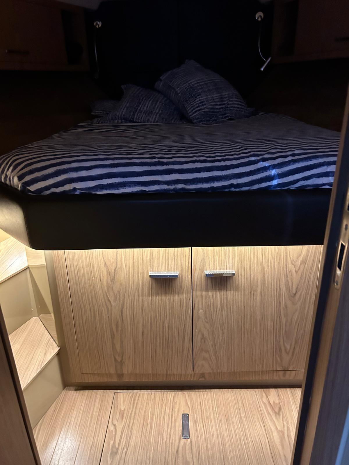 Engine Alarm, Bilge Alarm, Alternator, Water pressure pump, Deck Shower, Directional Spotlight, Electric Flaps, Hard top, Fire Extinguishing System, Washbasin in the cockpit, Courtesy Lights, Platform, Automatic Bilge Pump, Manual Bilge Pump, Teak Cockpit, Shorepower connector, Electric Windlass, swimming ladder, cockpit table, Living Room Foldable Table, guard rails with gates, Horn.