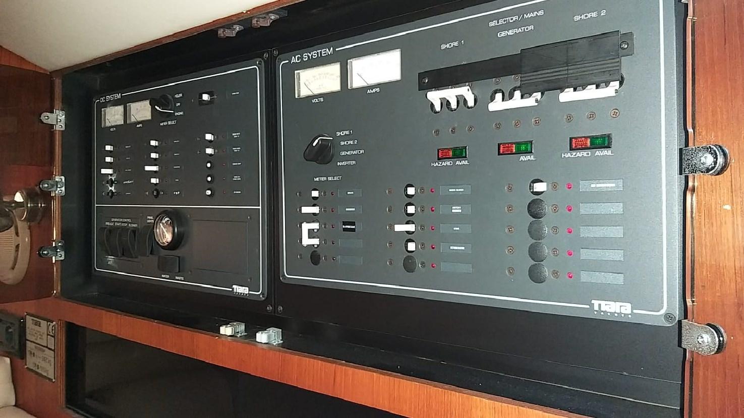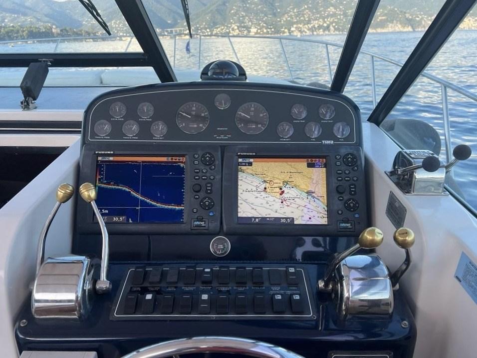 Rudder angle indicator, Radar Antenna, Electronic engine control, Depth Sounder (FURUNO), Autopilot (SIMRAD), Plotter with GPS antenna (FURUNO DOPPIO SCHERMO), Radar (FURUNO).