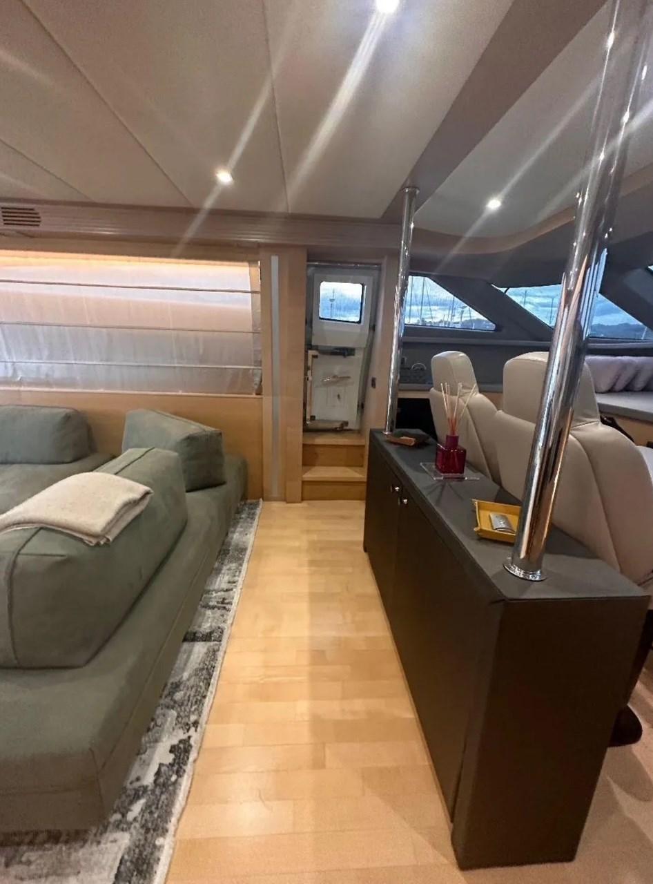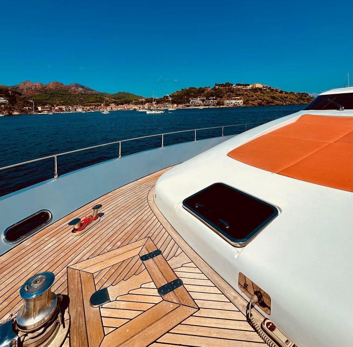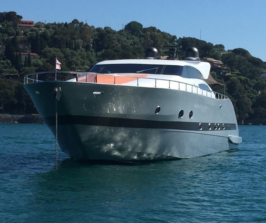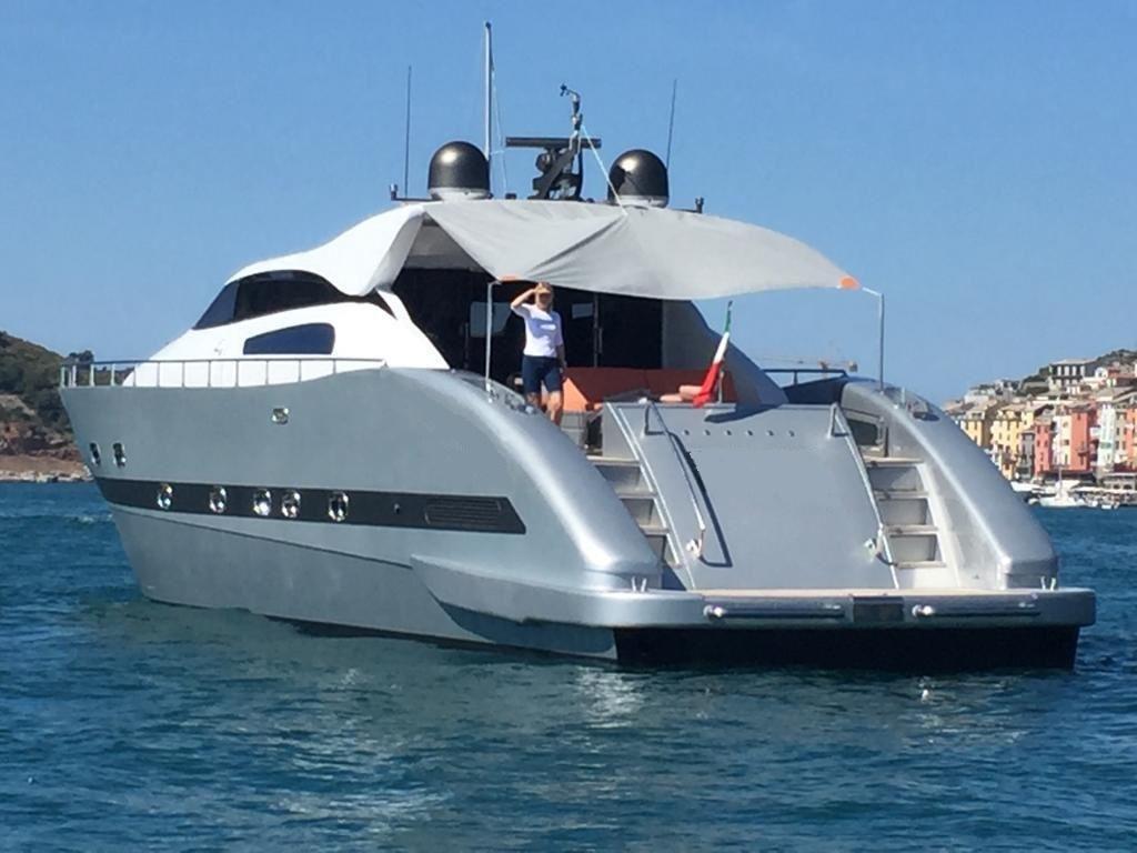 Fume/Gas Detector, Engine Alarm, Bilge Alarm, Alternator, Water pressure pump, Teak Side Decks, Shore power cable, Special Colour (ARGENTO METALLIZZATO), Guard rail, Deck Shower, Hydraulic Flaps, Tender Garage, Tender Crane, Hard top, Fire Extinguishing System, Flaps Indicators, Courtesy Lights, Underwater lights, Gangway, Platform, Automatic Bilge Pump, Manual Bilge Pump, Teak deck, Entry door, Side door, Teak Cockpit, Shorepower connector, Electric Windlass, swimming ladder, cockpit table, guard rails with gates, Horn, Stern Winches.