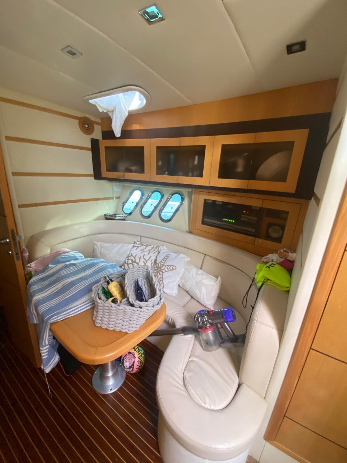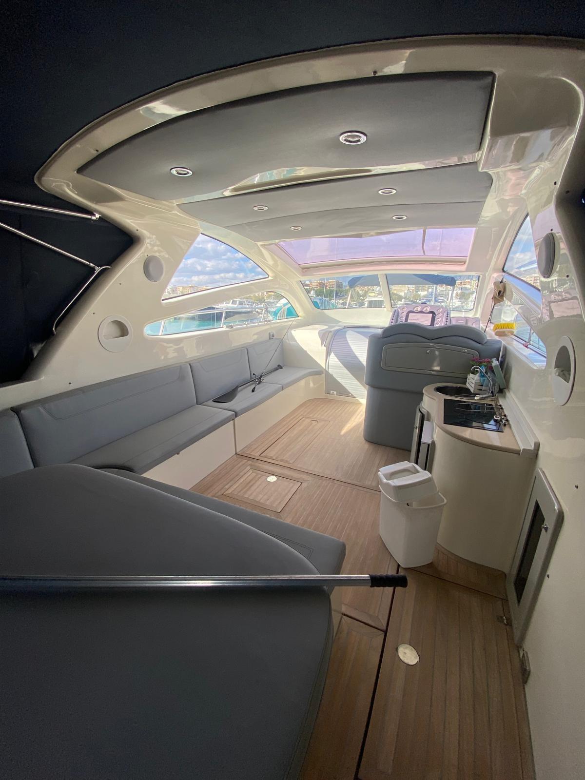 Engine Alarm, Bilge Alarm, Electric Engine Compartment Opening, Water pressure pump, Deck Shower, Directional Spotlight, Hydraulic Flaps, Hard top, Fire Extinguishing System, Flaps Indicators, Washbasin in the cockpit, Courtesy Lights, Underwater lights, Platform, Manual Bilge Pump, Teak Cockpit, Shorepower connector, Water harbor connector system, Electric Windlass, swimming ladder, cockpit table, Living Room Foldable Table, Tender, Horn.