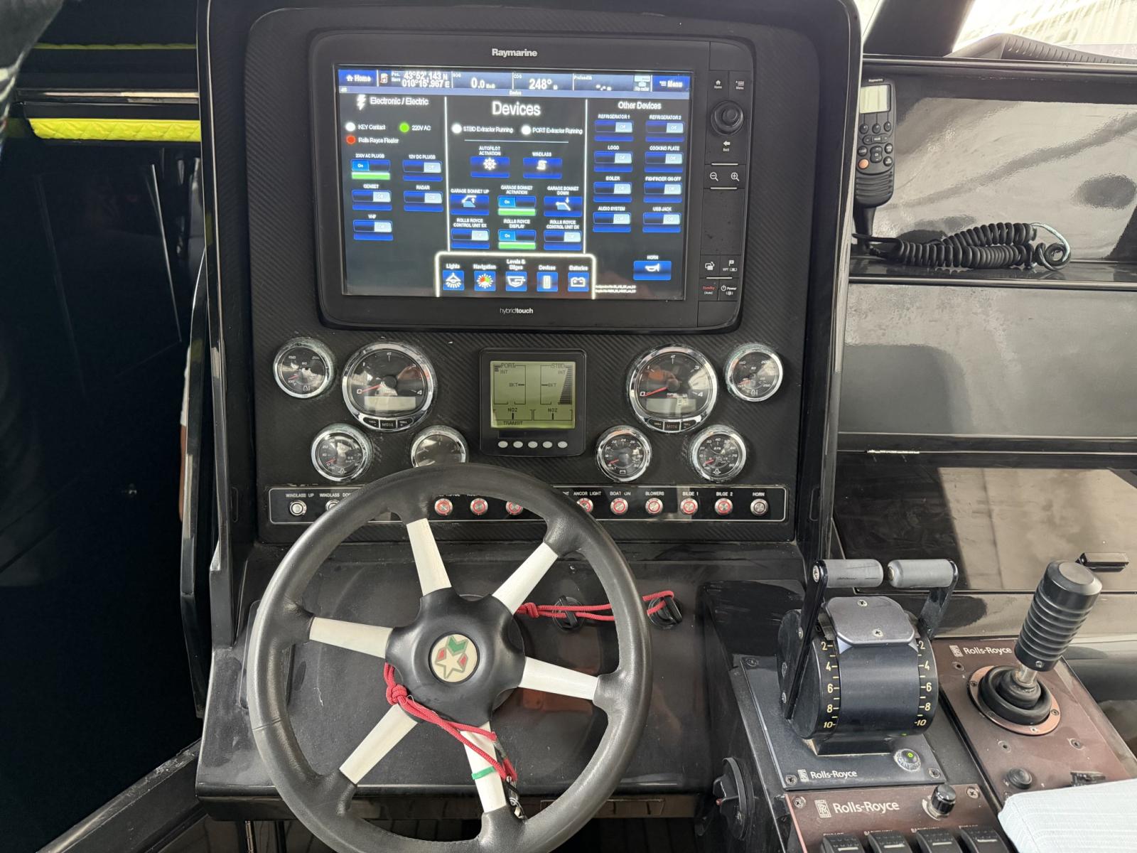 Rudder angle indicator, Display, Joystick, Consumption monitor, Plotter with GPS antenna, Co-pilot seat.