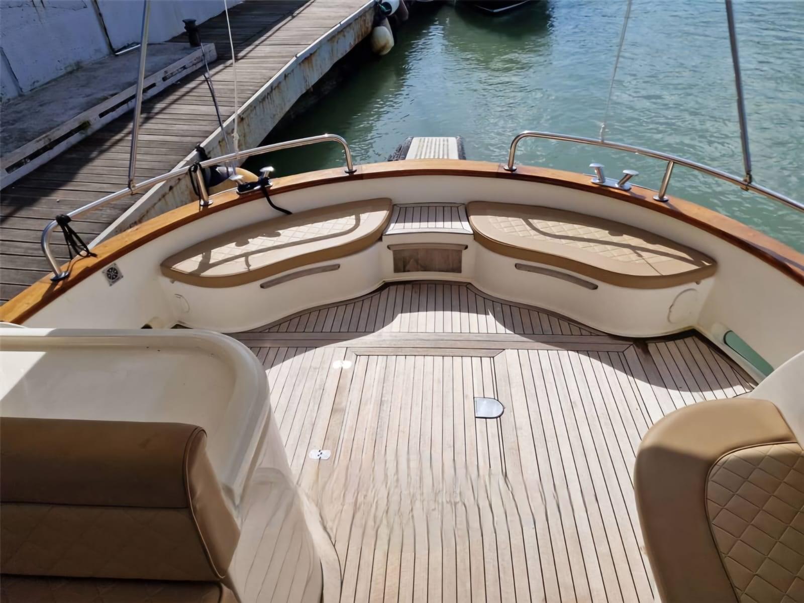 Engine Alarm, Bilge Alarm, Water pressure pump, 4 Batteries (4 x 200 Ah), Deck Shower, Hard top, Fire Extinguishing System, Flaps Indicators, Washbasin in the cockpit, Gangway (idraulica Besenzoni), Automatic Bilge Pump, Teak Cockpit, Shorepower connector, Electric Windlass, swimming ladder, Horn.