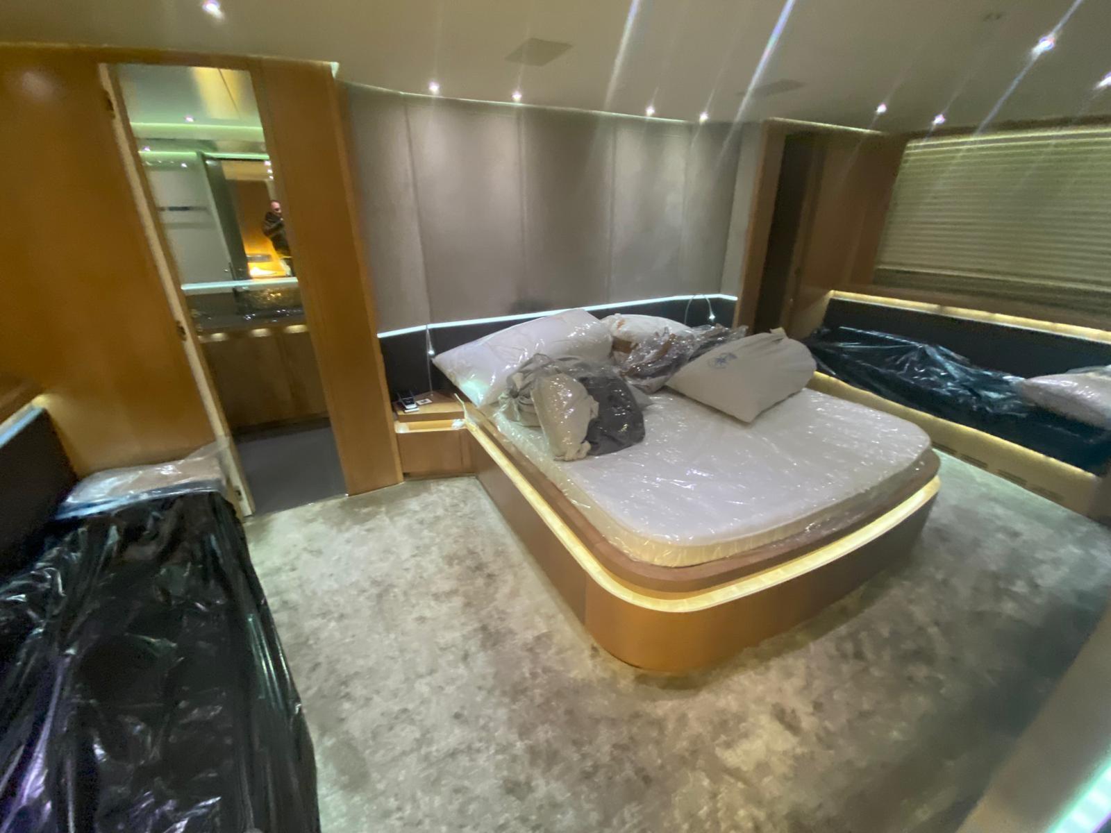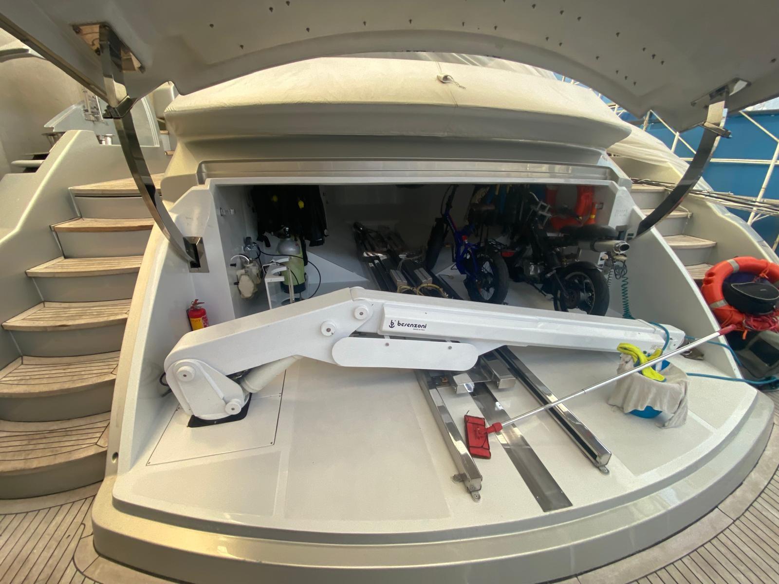 Engine Alarm, Bilge Alarm, Alternator, Water pressure pump, Folding cleats, Teak Side Decks, Shore power cable, Special Colour, Deck Shower, Headlights fixed on the stem, Directional Spotlight, Tender Garage, Tender Crane, Hard top, Fire Extinguishing System, Anchor Chain Washdown, Washbasin in the cockpit, Courtesy Lights, Underwater lights, Battery Monitor, Fenders, Platform, Waste Water Tank Drain Pump, Automatic Bilge Pump, Manual Bilge Pump, Teak deck, Entry door, Side door, Teak Cockpit, Shorepower connector, Water harbor connector system, Hydraulic Windlass, Gang Board, swimming ladder, Waste Water Purifier System, cockpit table, Horn, Winch Hydraulic, Stern Winches, Bow Winches.