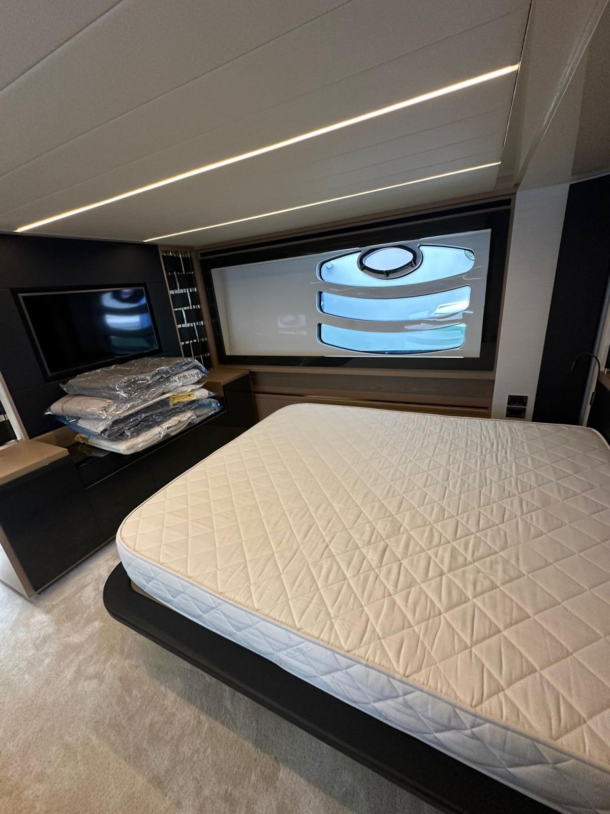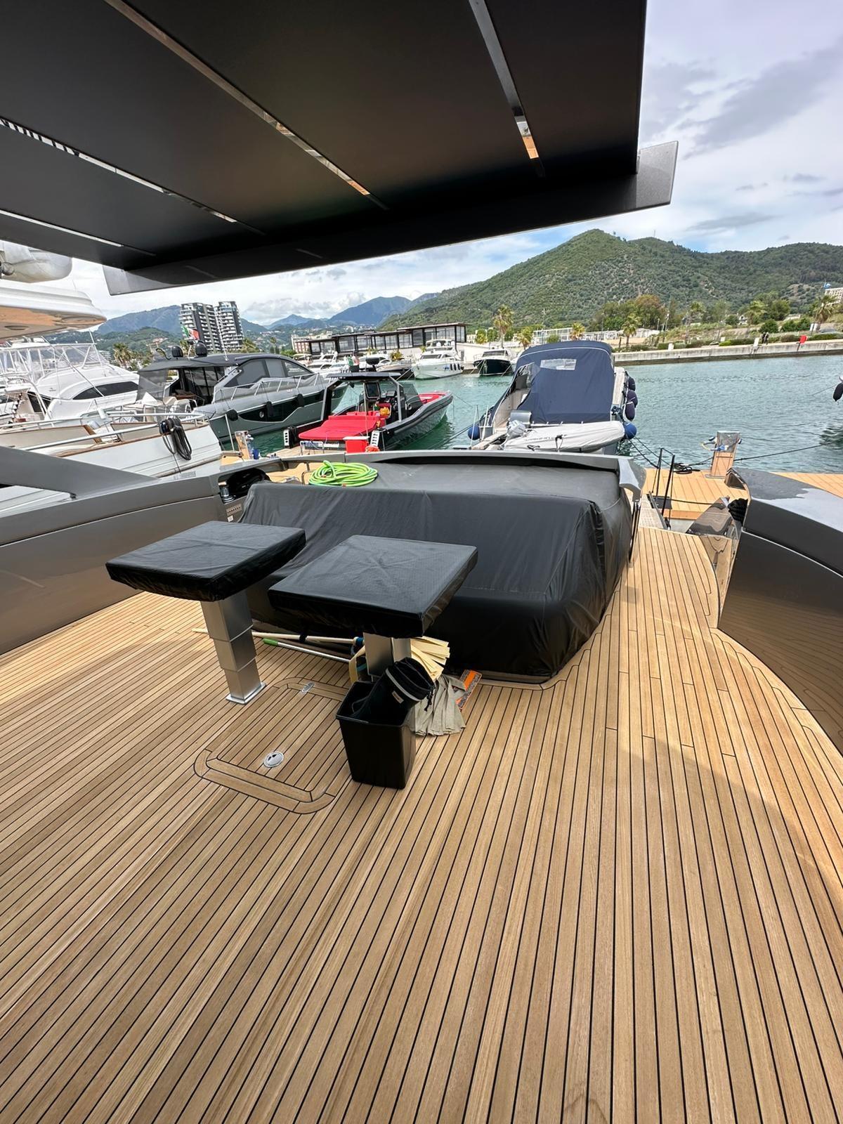 Engine Alarm, Bilge Alarm, Alternator, Water pressure pump, Folding cleats, Teak Side Decks, Deck Shower, Directional Spotlight, Hydraulic Flaps, Tender Garage, Hard top, Fire Extinguishing System, Flaps Indicators, Anchor Chain Washdown, Washbasin in the cockpit, Courtesy Lights, Underwater lights, Gangway, Platform, Automatic Bilge Pump, Manual Bilge Pump, Teak deck, Entry door, Teak Cockpit, Shorepower connector, Electric Windlass, swimming ladder, Stabilizers, cockpit table, Horn, 2 Stern Winches.