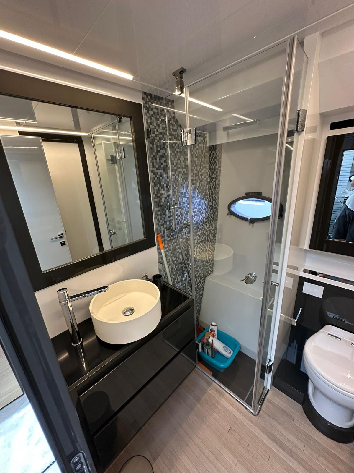 BBQ/Grill, Warm Water System, Safe, Inverter Air Conditioning, Internet Connection, Watermaker (IDROMAR 200 L/H), Waste Water Plant, 2 Inverter, Interior wooden floor, 12V Outlets, 220V Outlets, Black Water Tank, 2 Video camera, 4 Electric Toilet.
