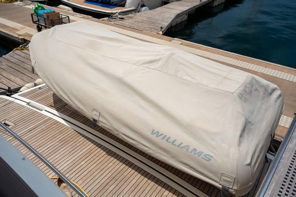 Engine Alarm, Bilge Alarm, Water pressure pump, Batteries (2025), Deck Shower, Twin Steering, Electric Flaps, Compressor Air System, Underwater lights (BLU), Gangway (IDRAULICA RETRATTILE), Platform (IDRAULICA), Automatic Bilge Pump, Entry door, Teak Cockpit, Shorepower connector, Water harbor connector system, Electric Windlass, swimming ladder, cockpit table (TEAK CON COPERTURA), Tender (WILLIAMS TURBOJET 325 (ROTAX 90 HP)), Stern Winches.