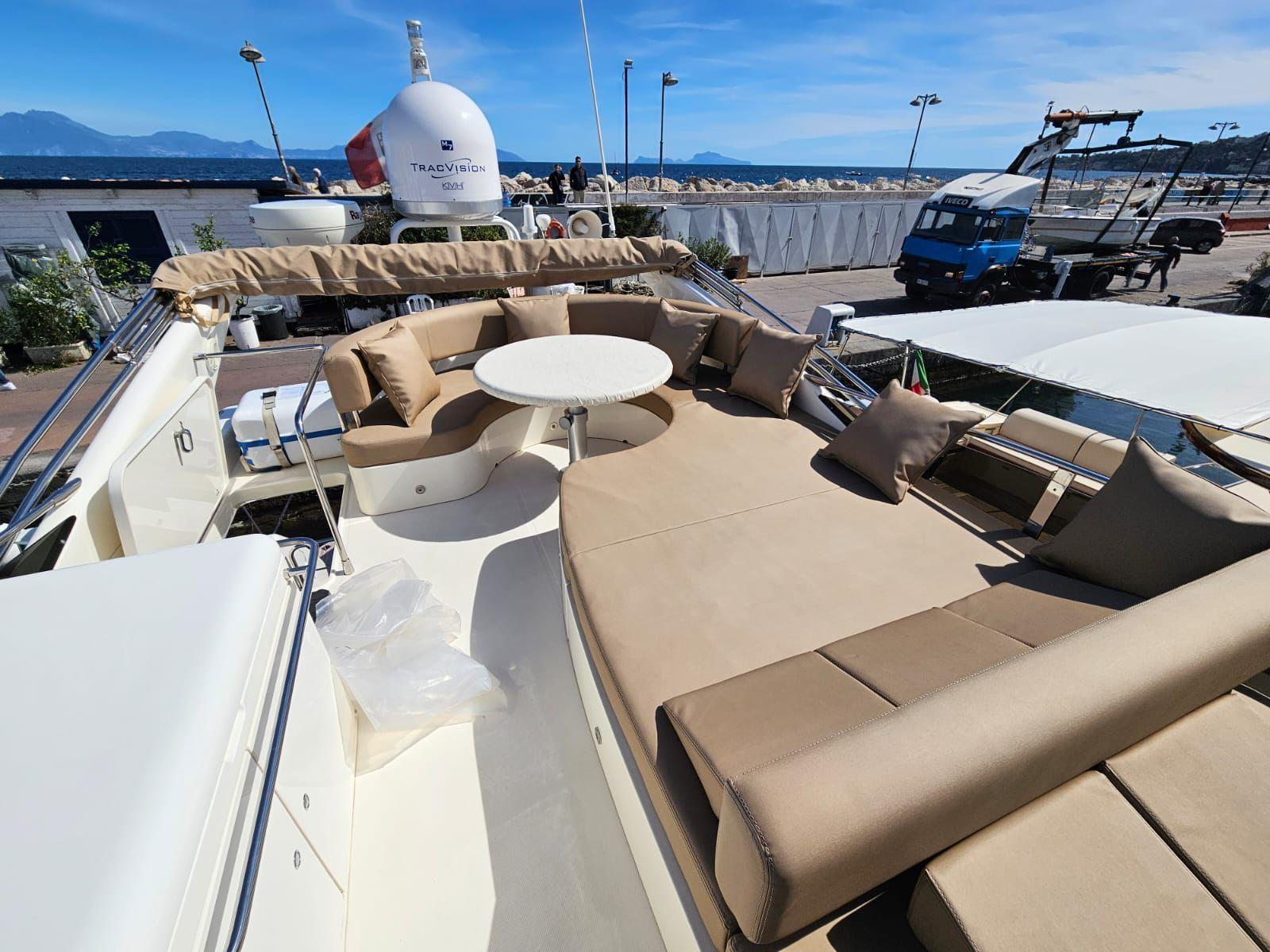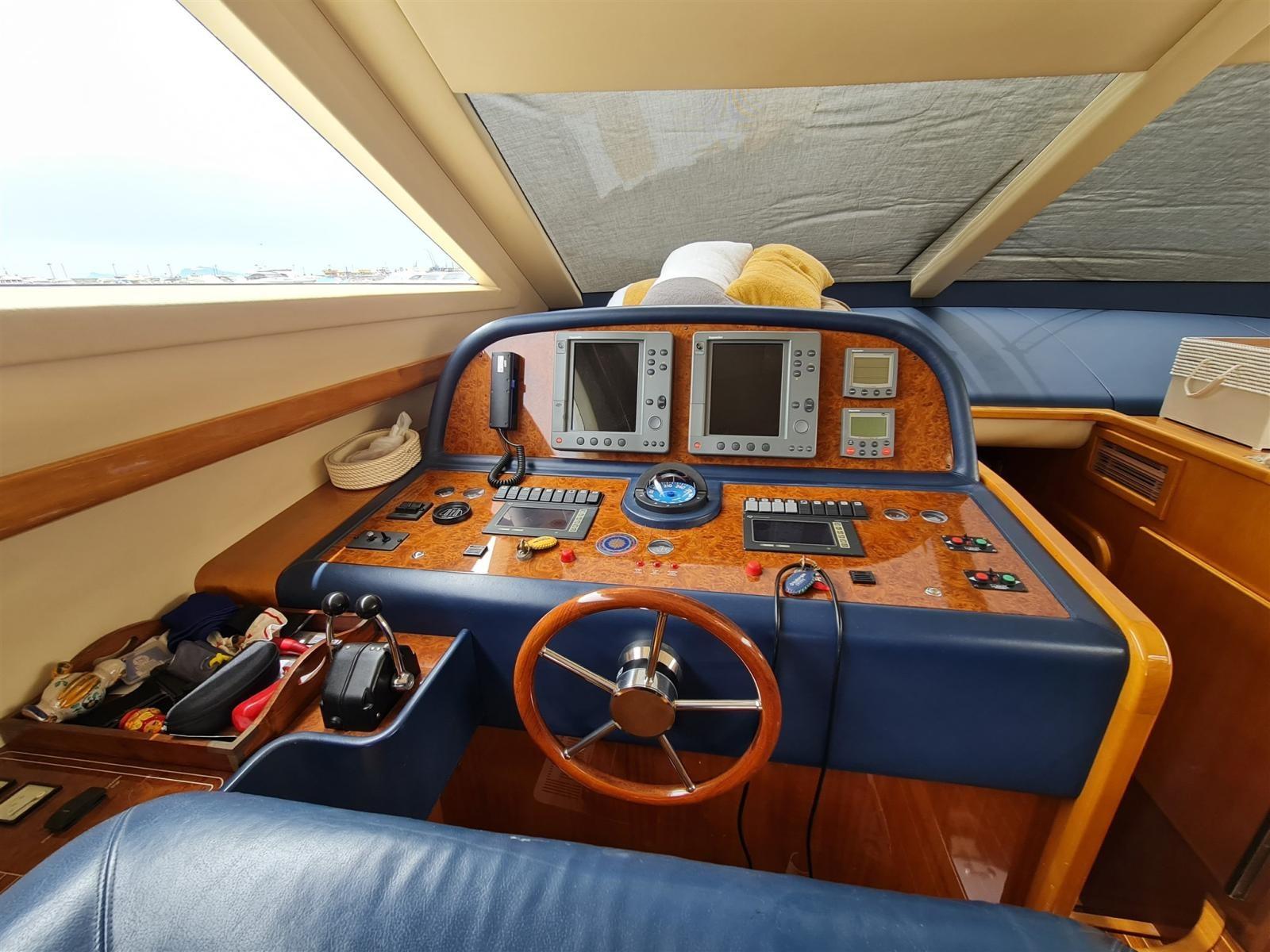 2 Engine Alarm, Bilge Alarm, Water pressure pump, Special Colour (Blu Navy), Deck Shower, Twin Steering, Headlights fixed on the stem, Hydraulic Flaps, Fire Extinguishing System, Flaps Indicators, Courtesy Lights, Gangway (elettroidraulica), Platform, 5 Automatic Bilge Pump, Entry door, Teak Cockpit, Shorepower connector, Voltage Rectifier, Rollbar, Electric Windlass, swimming ladder, cockpit table, Tender, Horn, 2 Stern Winches, Bow Winches.
