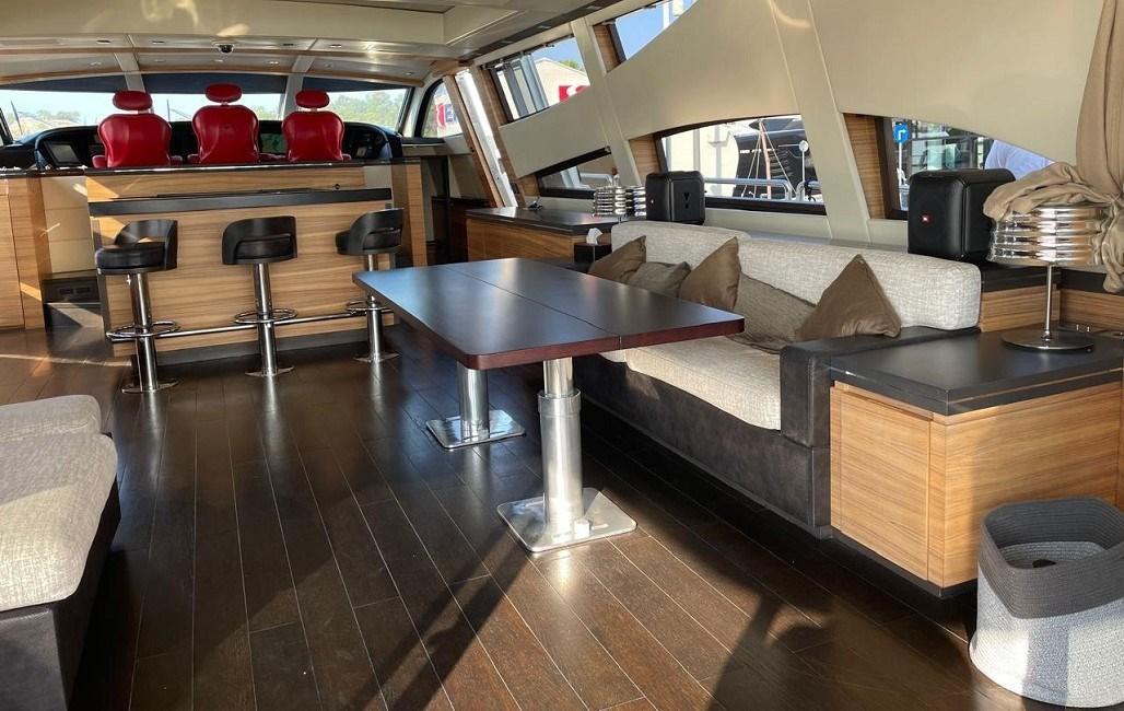 Entrance hall with lounge area, with L-shaped sofa on the left, sofa with folding tables on the starboard side | Central corner bar behind the wheelhouse with panoramic roof | Home cinema room in the bow with 60" 3D TV that converts into a 5th double cabin with sofa beds and bathroom
