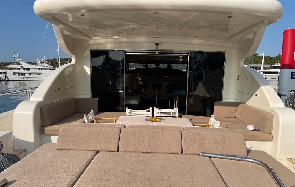 In front of the entrance to the main salon there are corner sofas on both sides with two tables and a sofa that joins a large sundeck along the stern. A staircase on either side leads to the bathing platform on the lower deck. Side walkways lead along the main deck to the foredeck, where there is another C-shaped sofa with two tables and large sun loungers