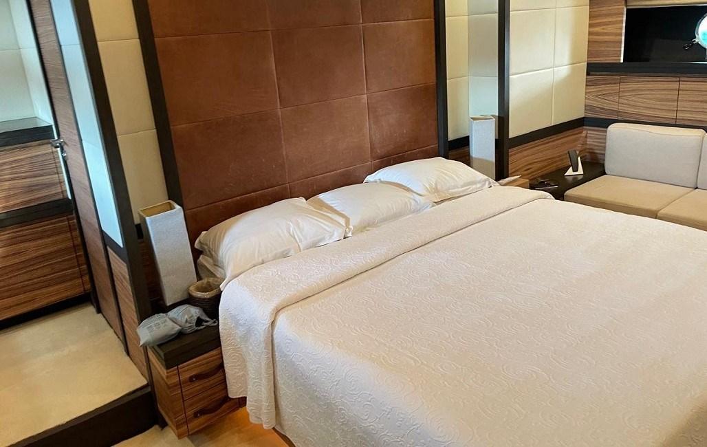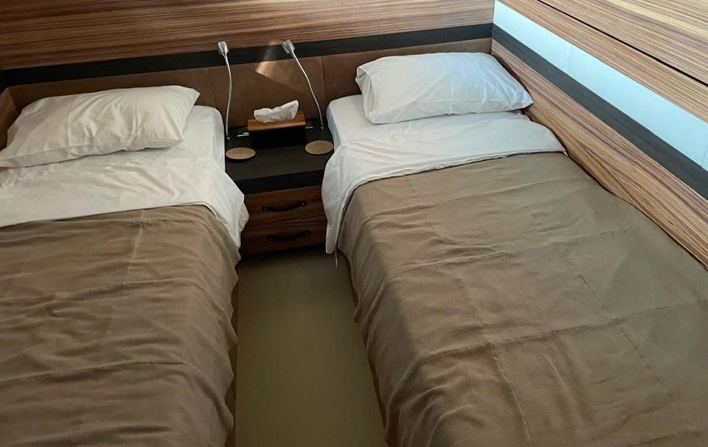 Full-beam midship owner's suite, king size bed, lounge area, widescreen TV and en-suite bathroom | VIP cabin in the bow with king size bed, lounge area, widescreen TV and en-suite bathroom | Guest cabin with double bed, widescreen TV and private bathroom on the starboard side, between the VIP and master cabins | Guest cabin with flat beds, optional coach, widescreen TV and private bathroom on the left | Crew cabin with flat beds and private bathroom with independent entrance from the forepeak | Captain's cabin with single bed, crew cabin with bunk beds, galley and laundry amidships and engine room aft