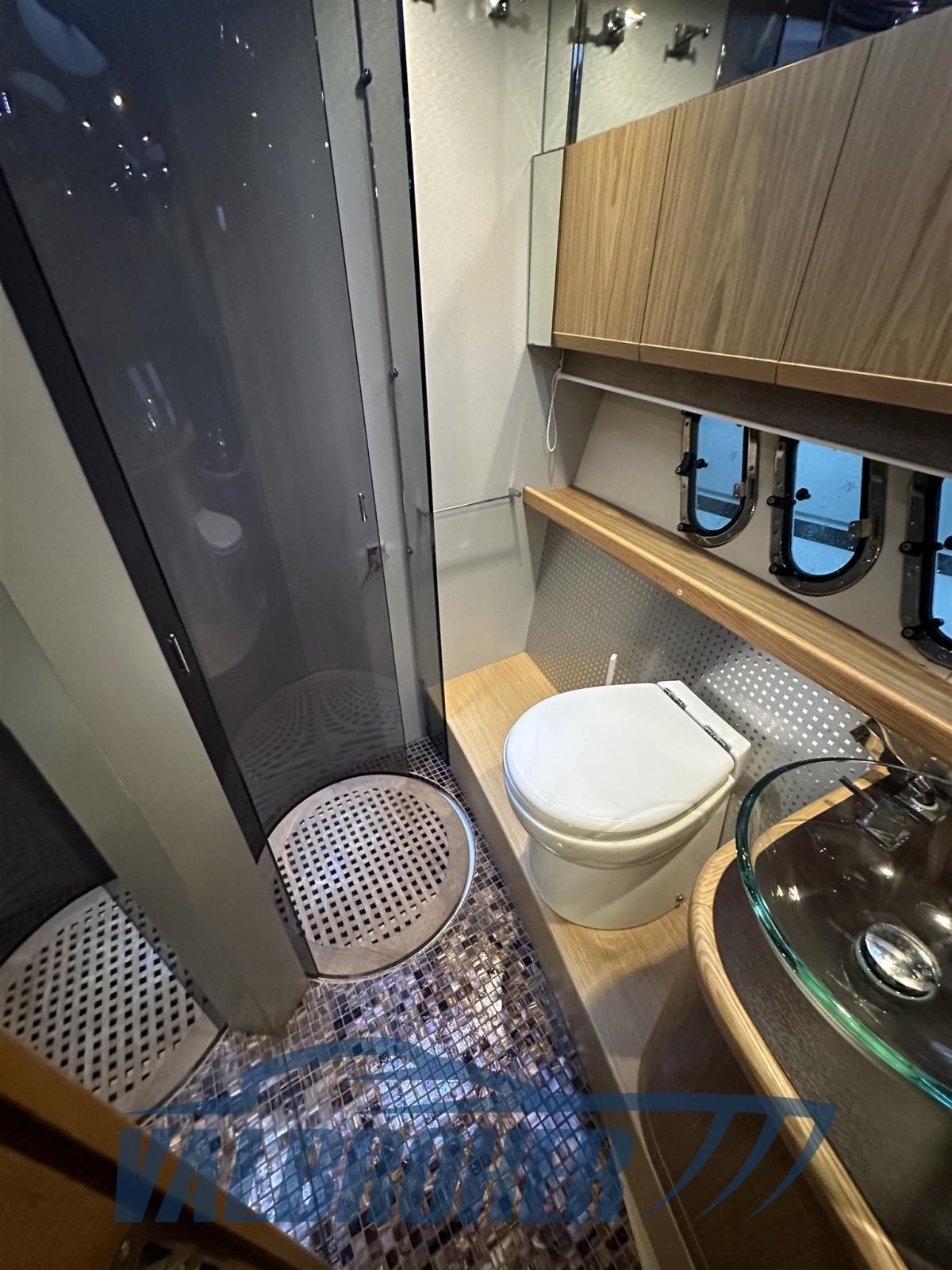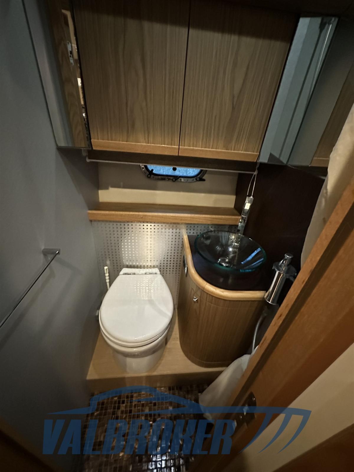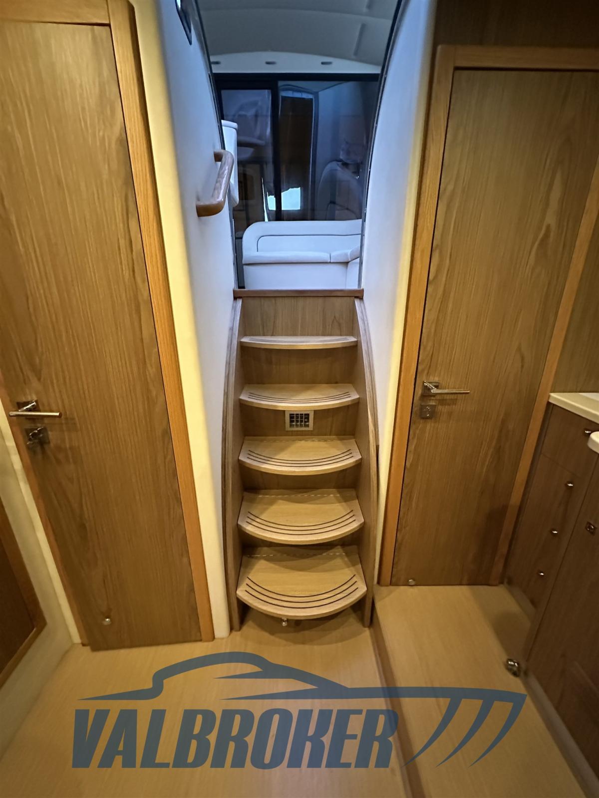 Practical coupé with door from the Lake Como shipyard with three cabins on the floor: double cabin in the bow, guest cabin with two separate beds (joinable), cabin with French bed and two bathrooms. It drives 2x IPS 600 Volvo Penta with Joystick and only 600 hours of operation. Interior in light woods.