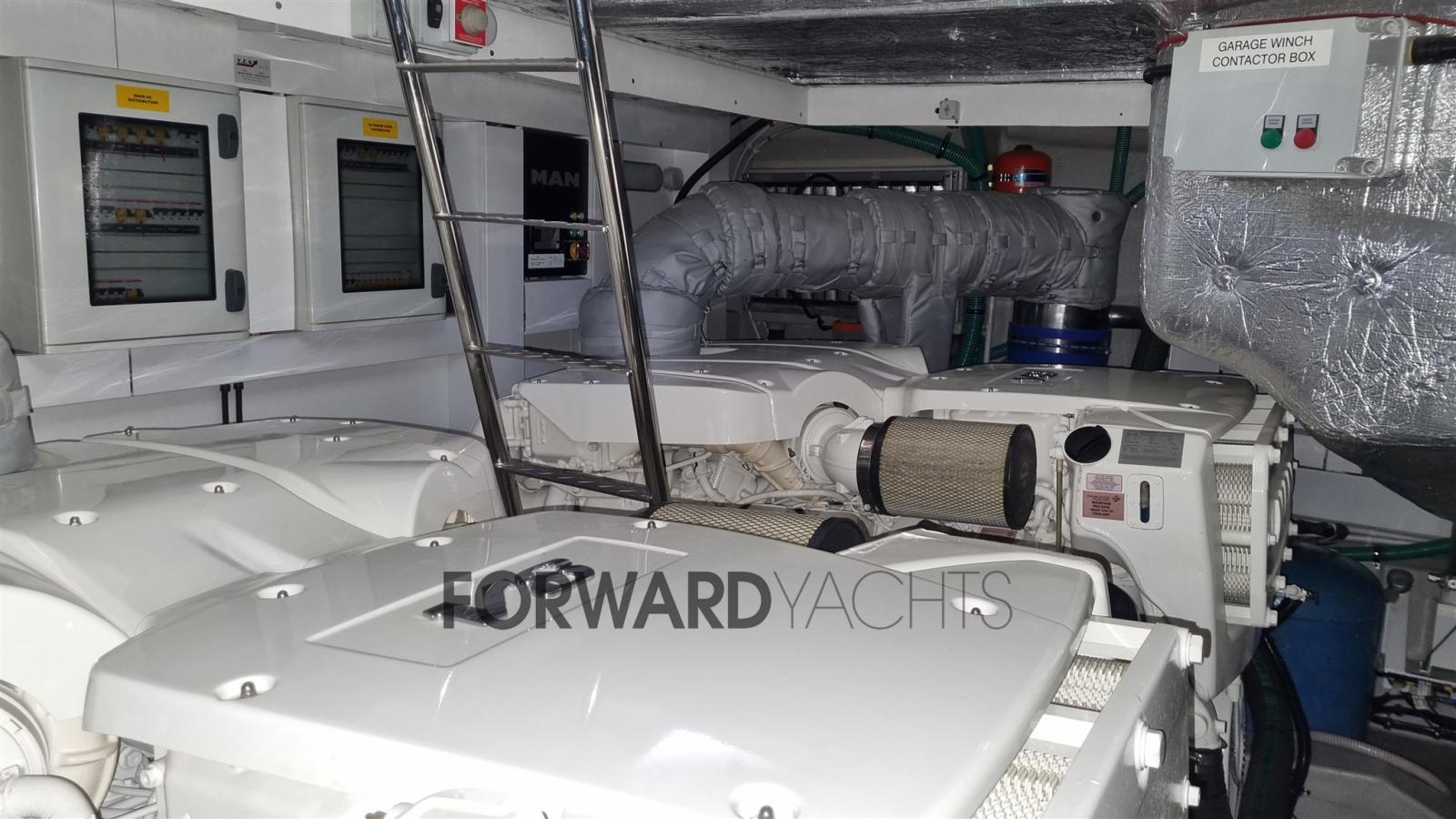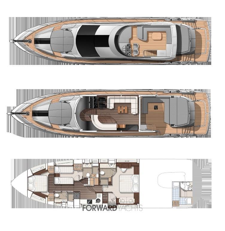Layout 3 cabins, full optional: bow thruster, generator, air conditioning, autopilot, full LED lighting, garage tender, electro-hydraulic stern platform.