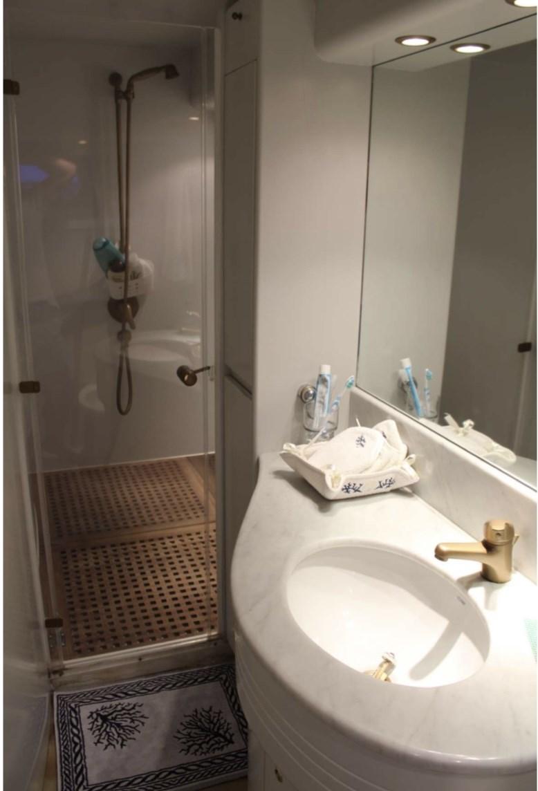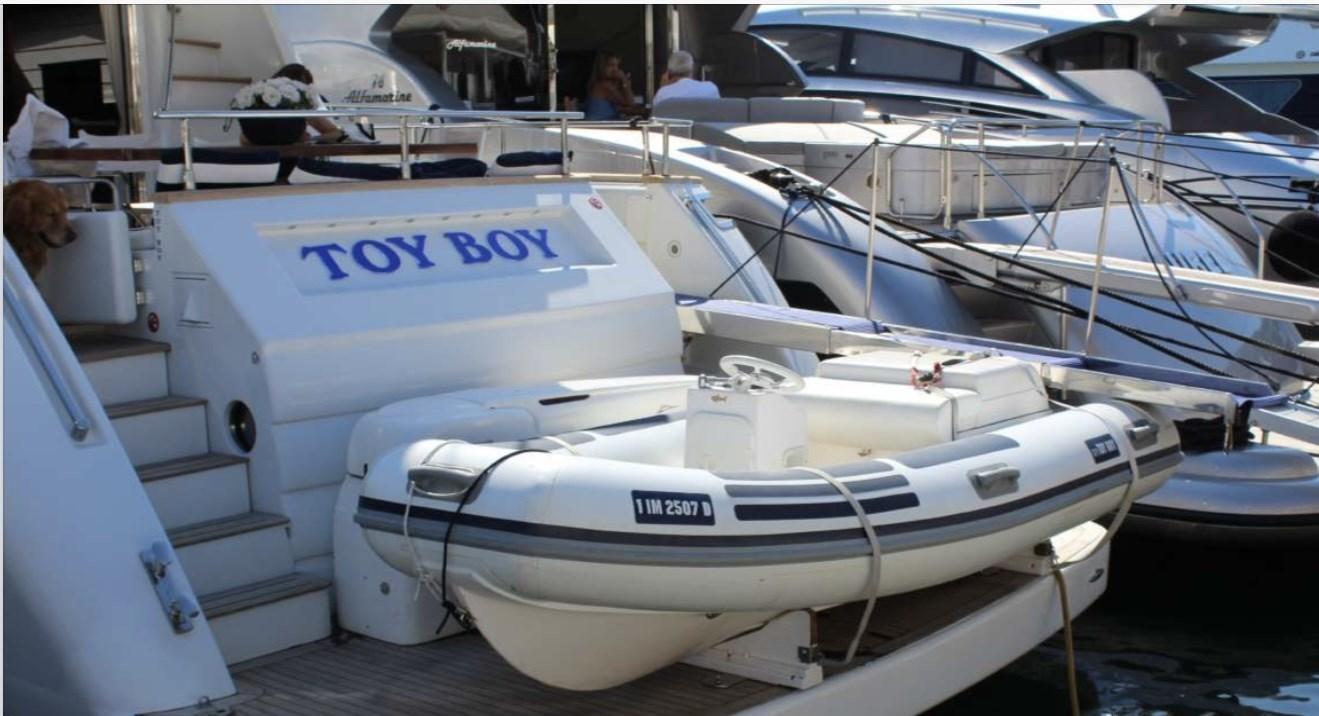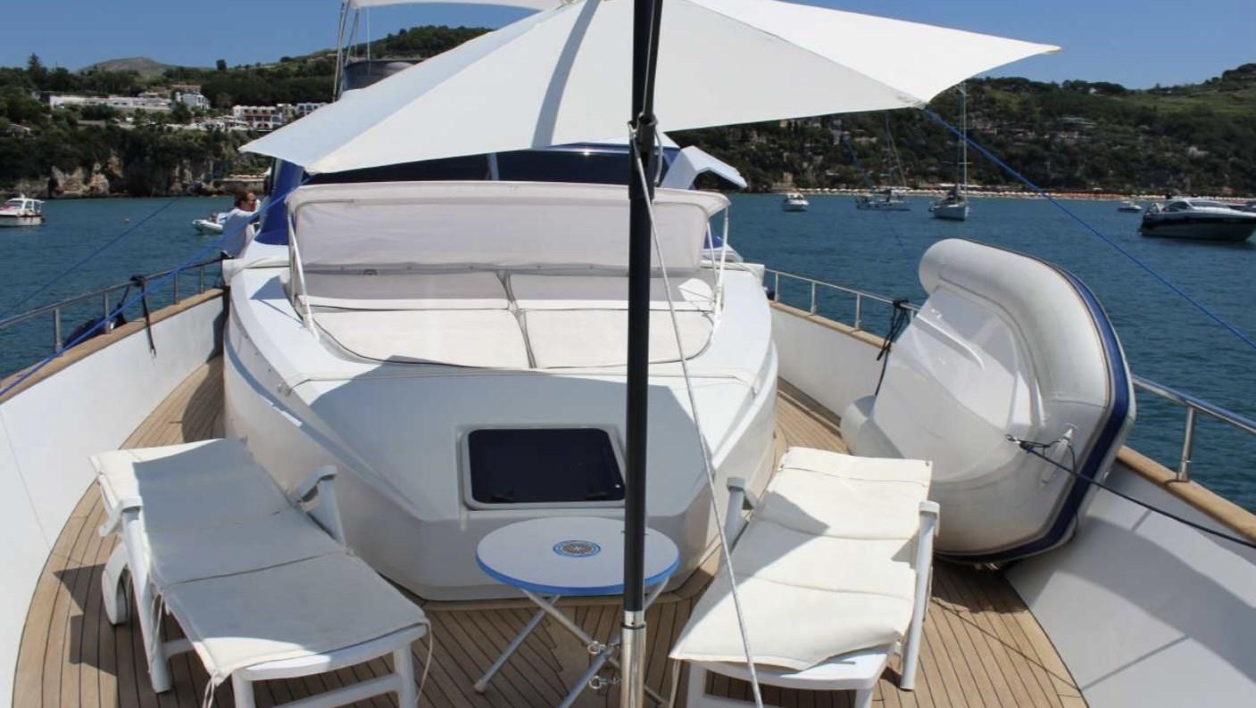 Fume/Gas Detector, Engine Alarm, 2 Anchor, Water pressure pump, Draining System, Teak Side Decks, Deck Shower, Twin Steering, Secondary Propeller, Hydraulic Flaps, Tender Crane, Fire Extinguishing System, Gangway, Platform, Automatic Bilge Pump, Manual Bilge Pump, Entry door, Teak Cockpit, Shorepower connector, Hydraulic Windlass, swimming ladder, Saddles for tender, cockpit table, Tender, Horn, Stern Winches, Bow Winches.
