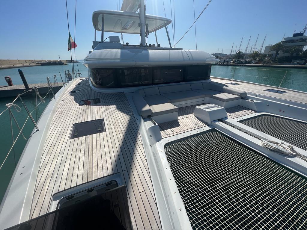 Fume/Gas Detector, Engine Alarm, Bilge Alarm, Water pressure pump, 4 Batteries (GEL DA 210AH), Teak Side Decks, Deck Shower, Headlights fixed on the stem, Washbasin in the cockpit, Courtesy Lights, 4 Underwater lights (BLU), Gangway (CARBONIO 260), Automatic Bilge Pump, Manual Bilge Pump, Entry door, Teak Cockpit, Shorepower connector, Water harbor connector system, Electric Windlass, Strand rigging, swimming ladder, Saddles for tender (PIATTAFORMA IDRAULICA CON TELECOMANDO), cockpit table, Tender (HIGHFIRLD CL420 GREY + HONDA 40/60), 3 Winch Electric, Windex.