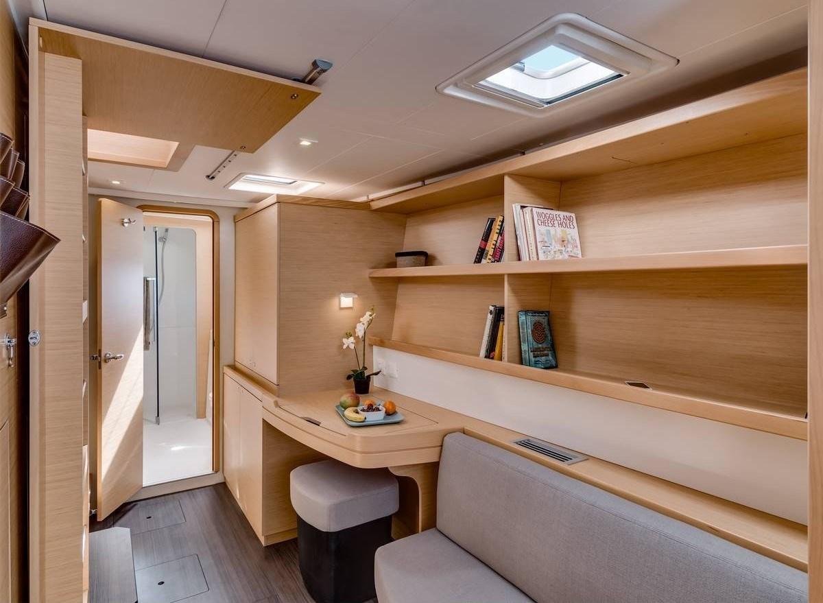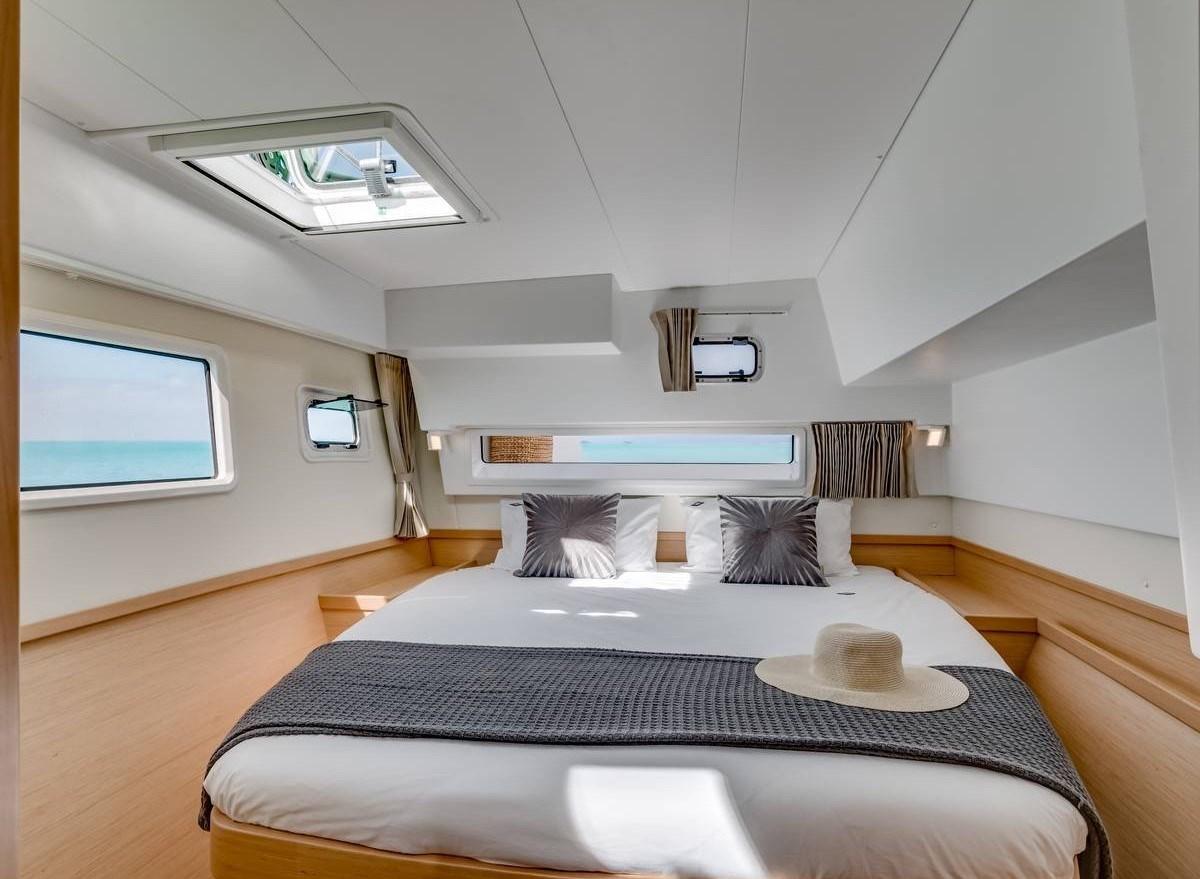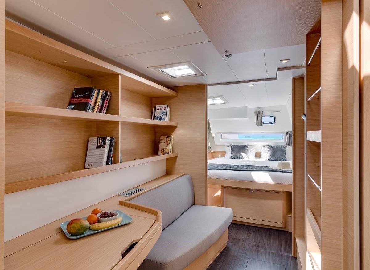 The interior layout is in perfect harmony with the exterior lines of the catamaran. The immense dinette meets Lagoon standards: panoramic view of the exterior, beautiful light, smooth circulation, selected and durable materials