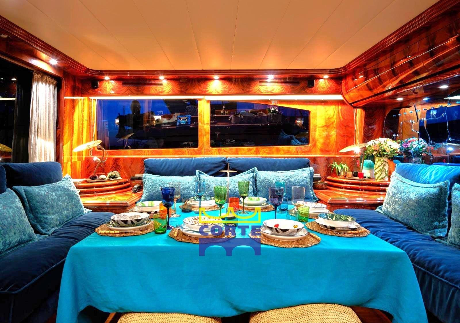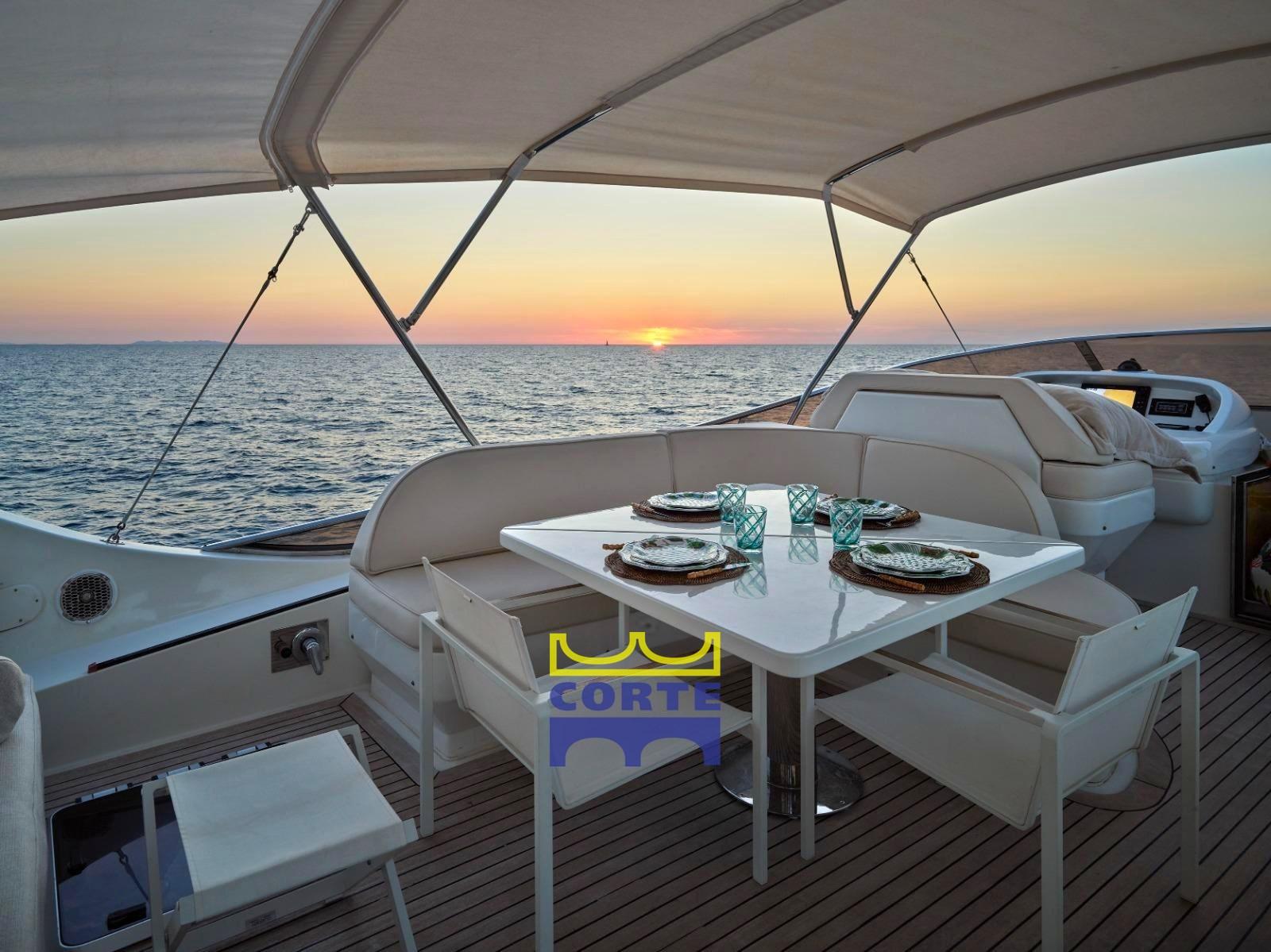 The cockpit, ideal for spending pleasant evenings with friends, the elongated beach in direct contact with the sea, the flybridge, the protagonist of the outdoor spaces, equipped with furnishings that determine its undisputed style, have made it complete and impeccable.