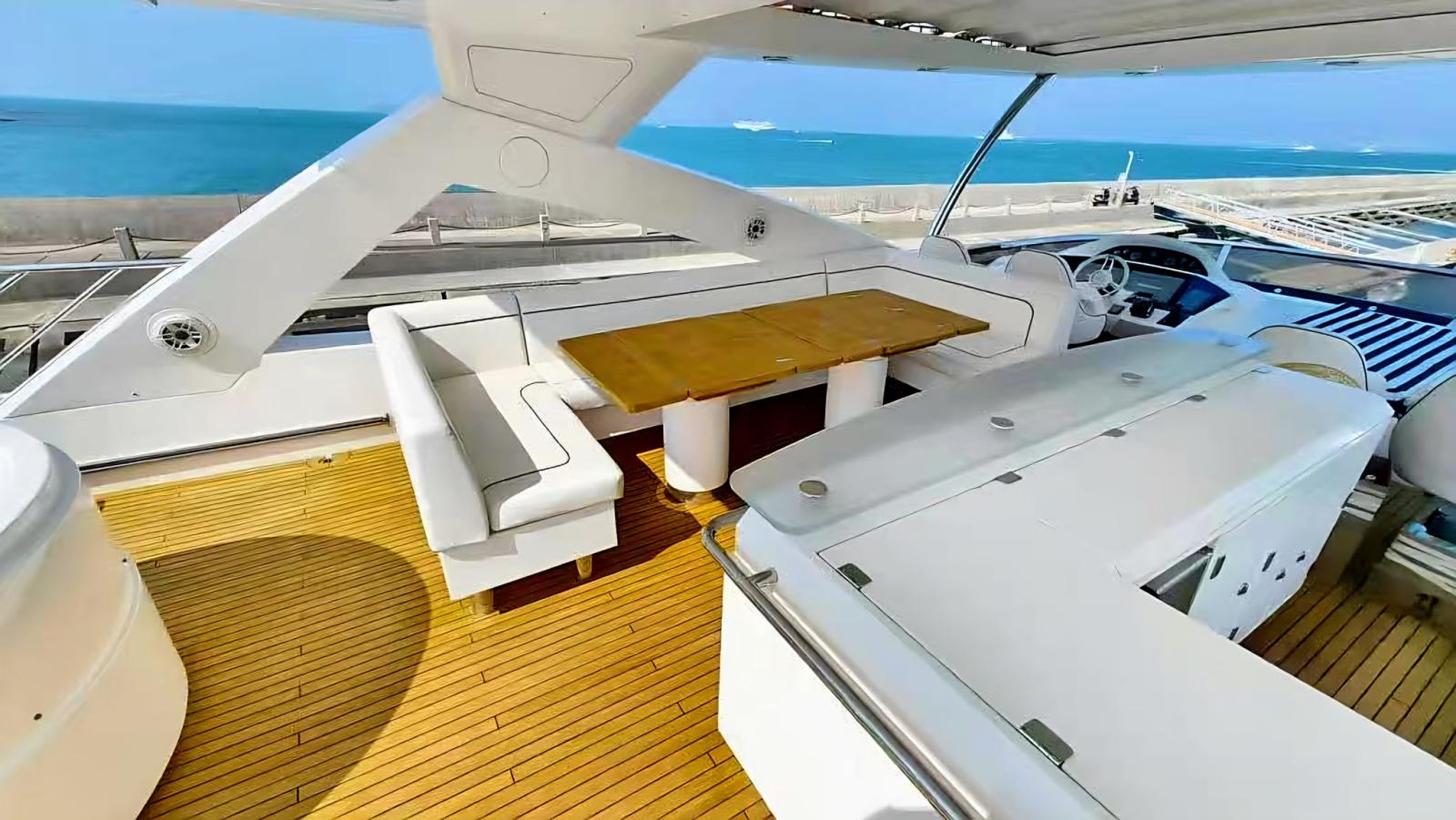 Very large teak flybridge, with helm station with 4 seats, sundeck, corner bar, dining area and a relaxation area aft with sundeck and Jacuzzi