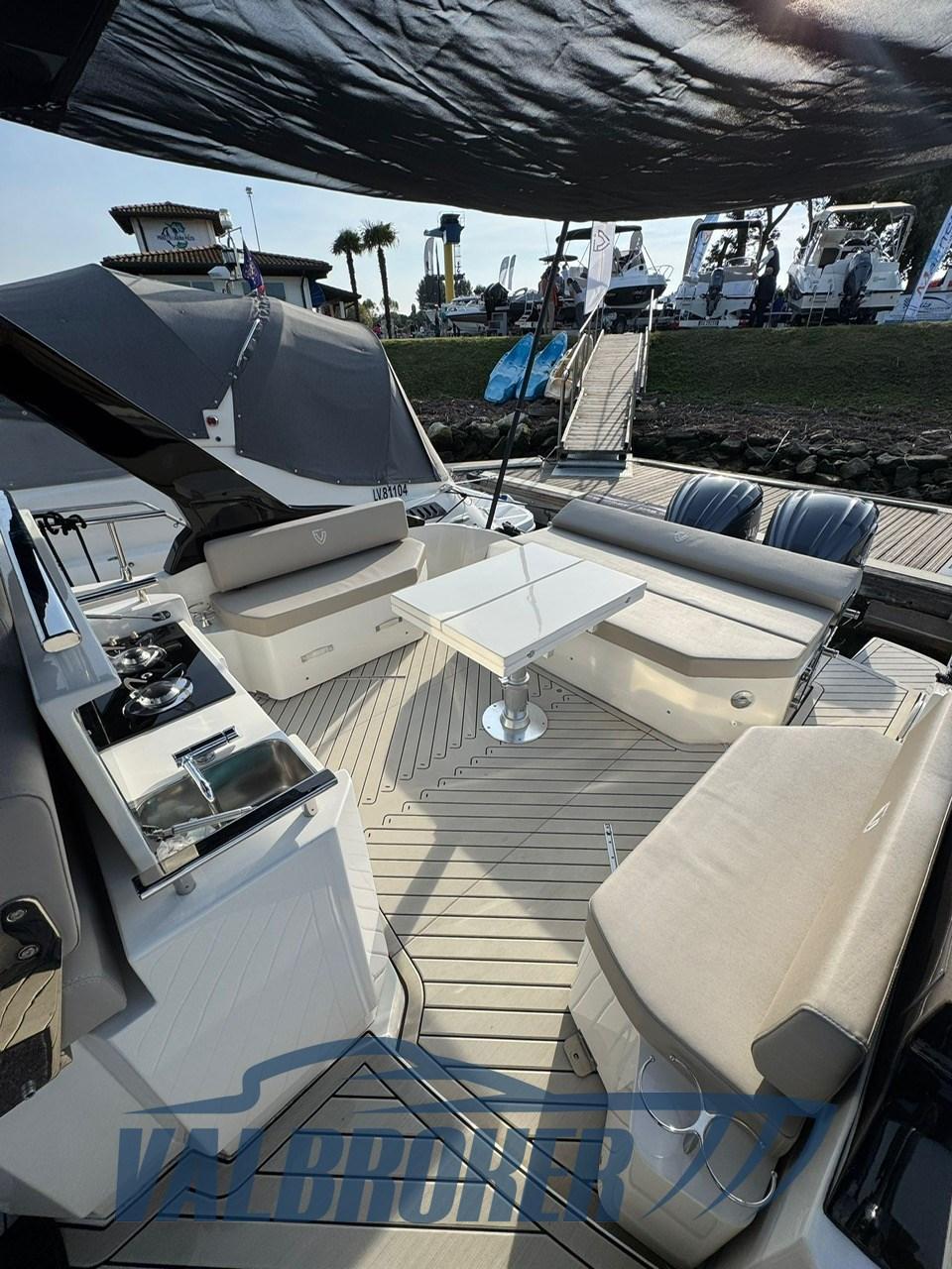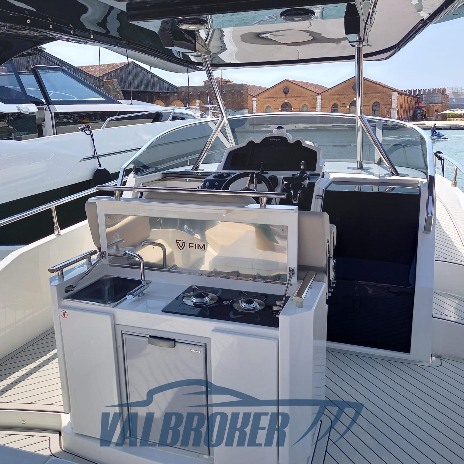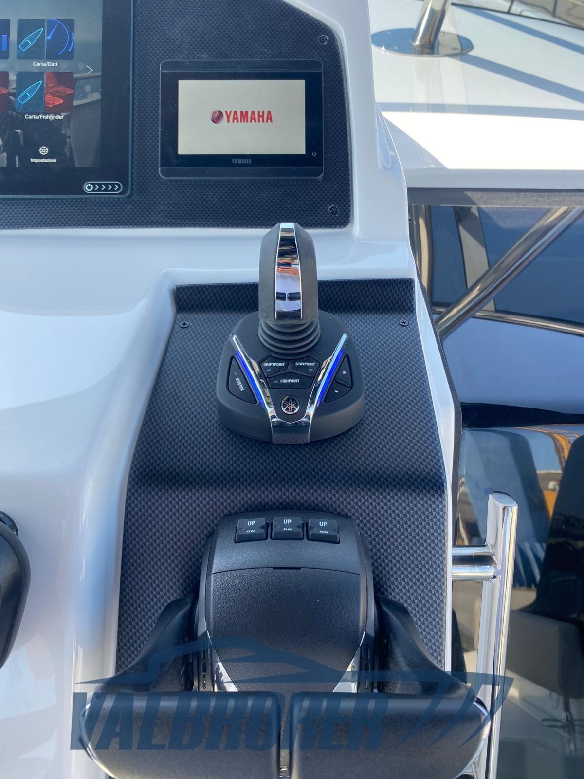 FULL OPTIONAL: Joystick Yamaha, bow thruster, air conditioning hot/cold 7000 BTU, autopilot, sunbathing cushions XL at stern on sliding guide and folding backrest, external kitchen, glossy black T-TOP. Gray seadeck with black joints in the cockpit and side walkways. It doesn't burn and doesn't need maintenance.