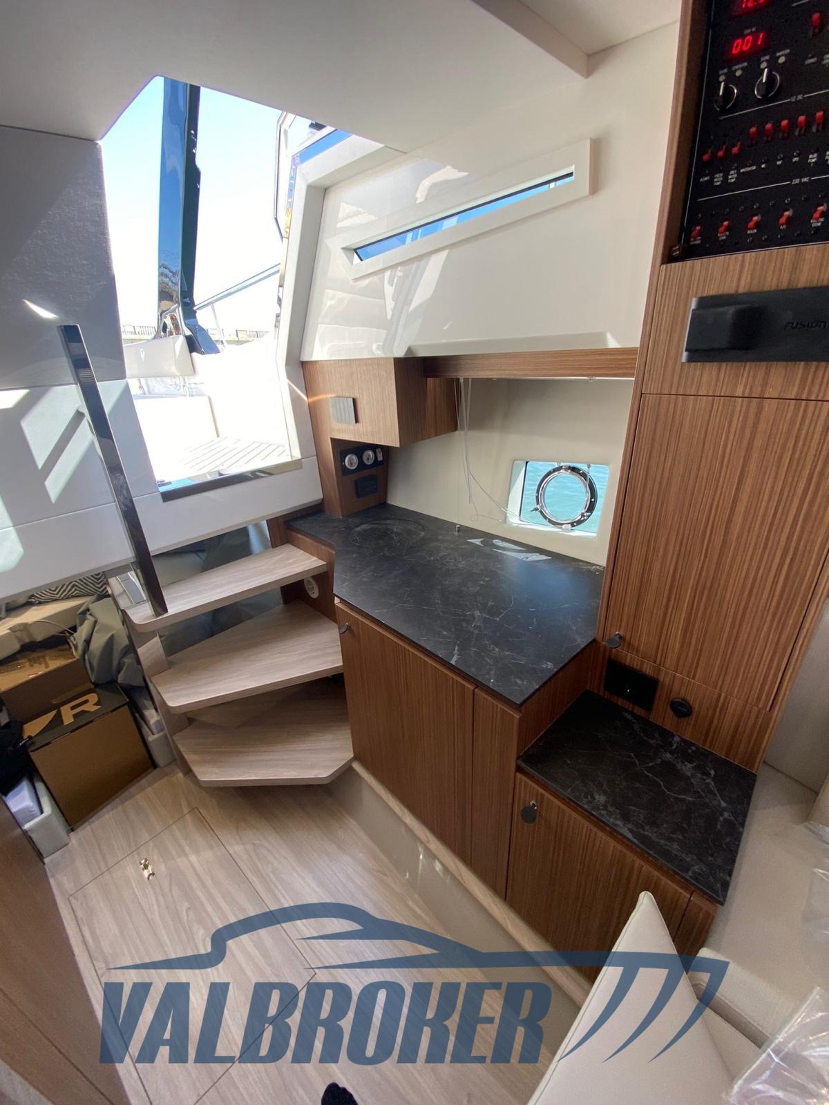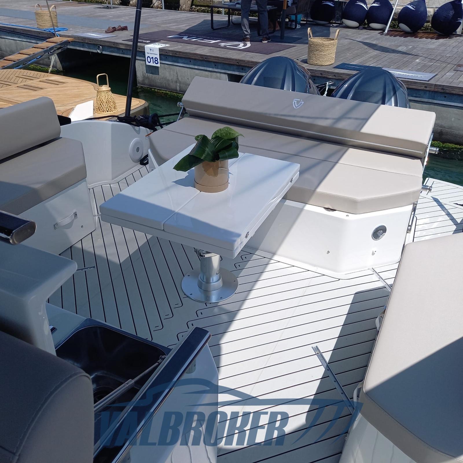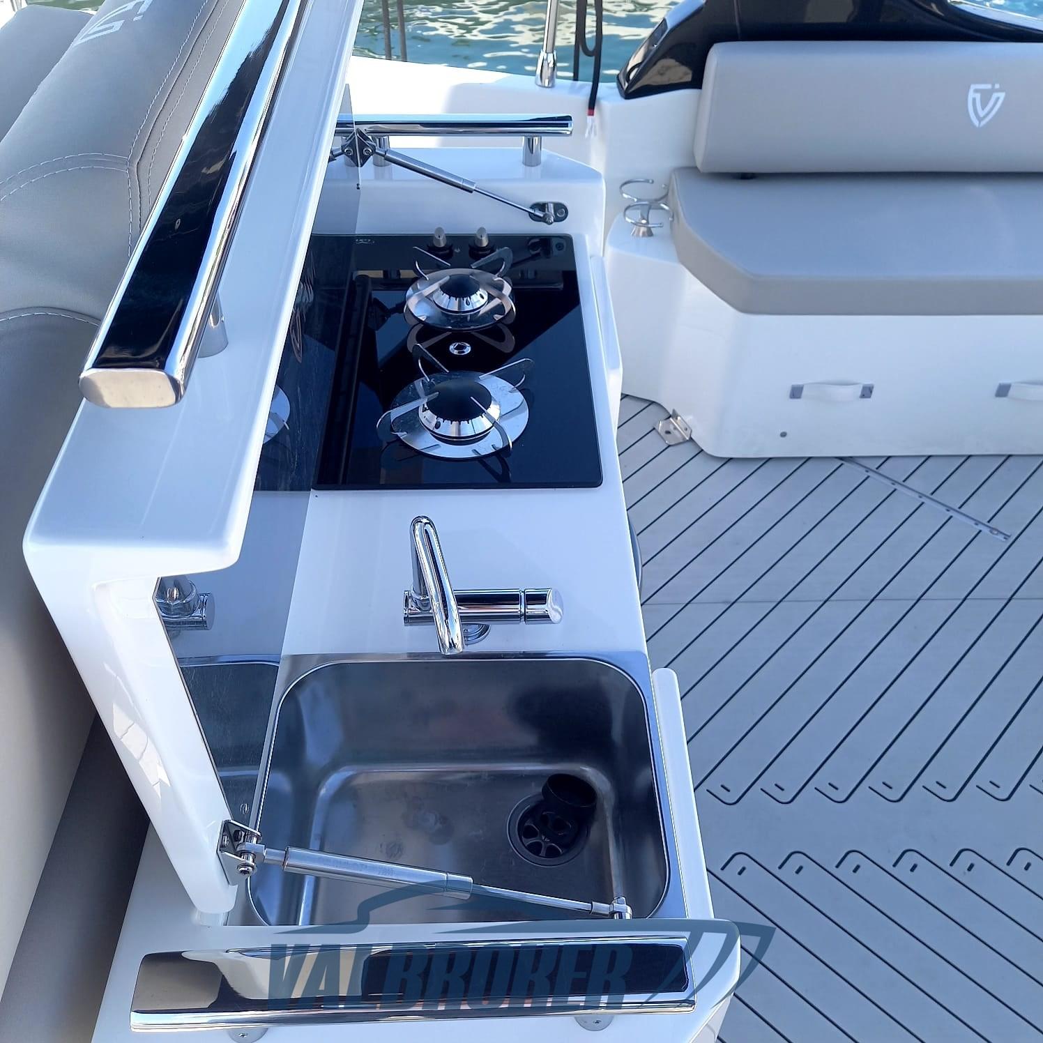FULL OPTIONAL: Joystick Yamaha, bow thruster, air conditioning hot/cold 7000 BTU, autopilot, sunbathing cushions XL at stern on sliding guide and folding backrest, external kitchen, glossy black T-TOP. Gray seadeck with black joints in the cockpit and side walkways. It doesn't burn and doesn't need maintenance.