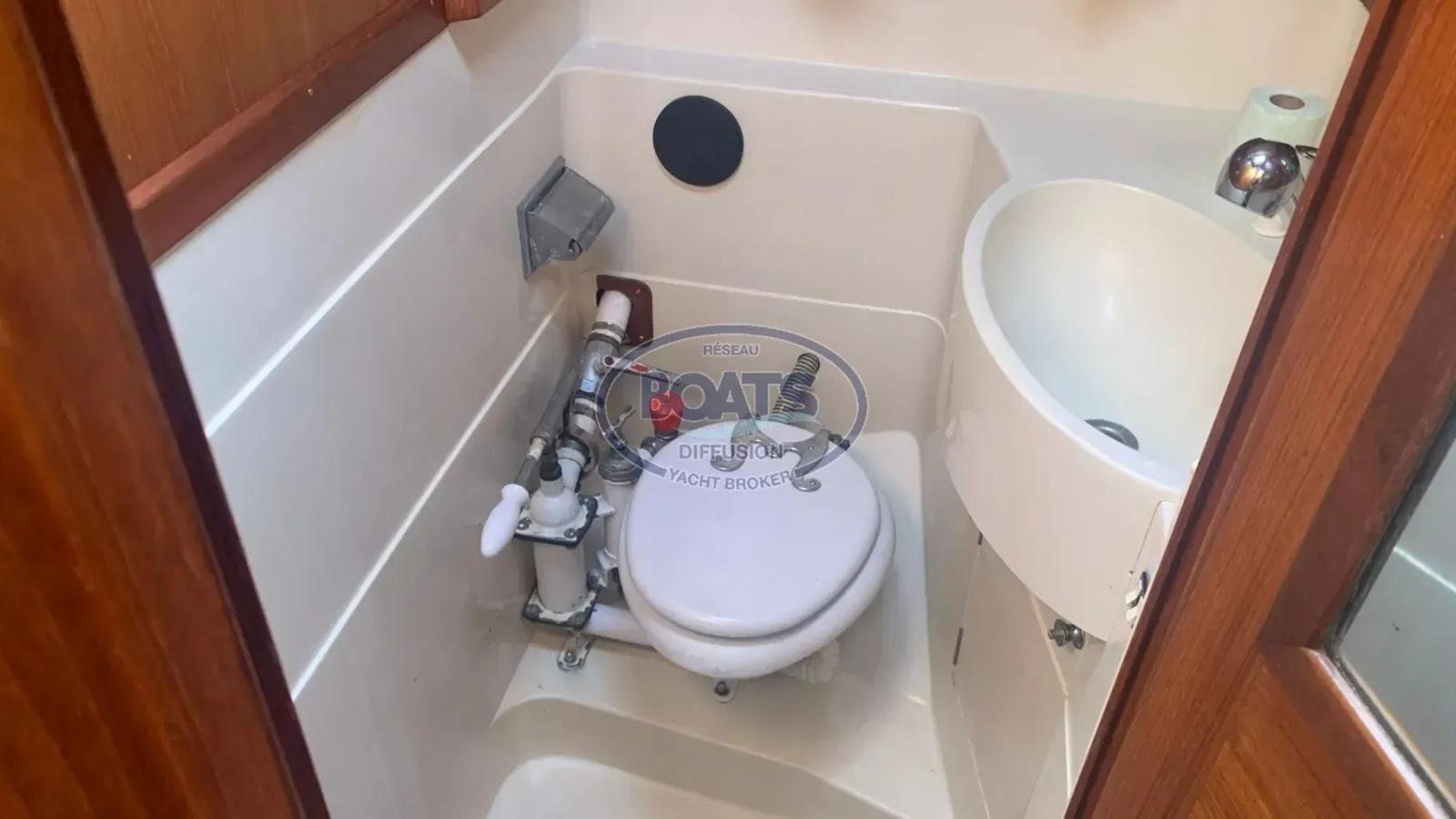 Fully equipped galley: ENO stove with oven, Vitrifrigo fridge (freezer + hull heat exchanger), double stainless steel sink, ample storage.