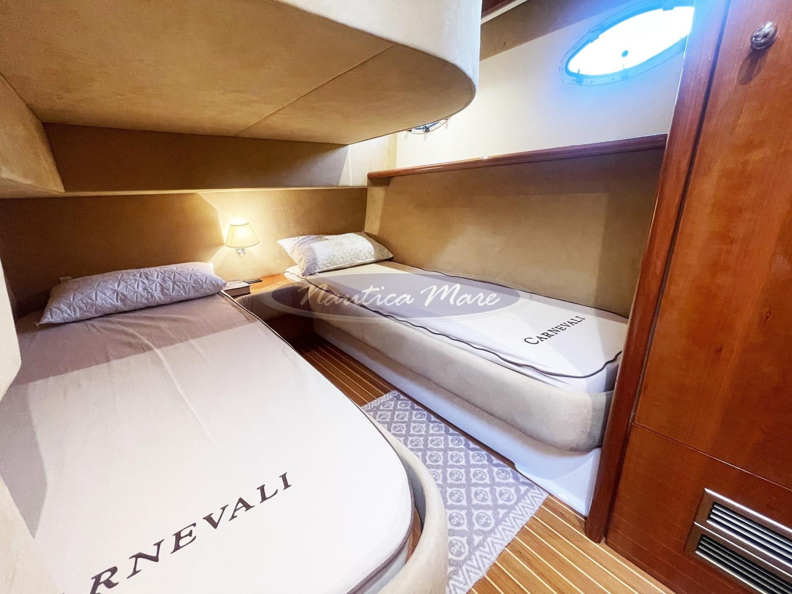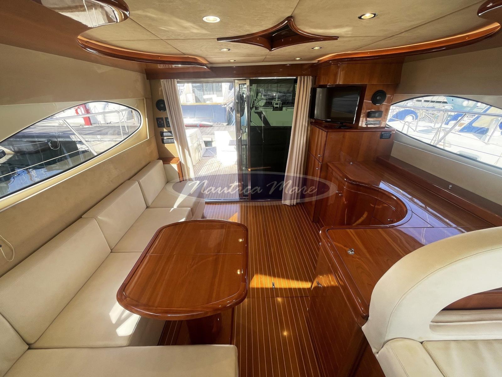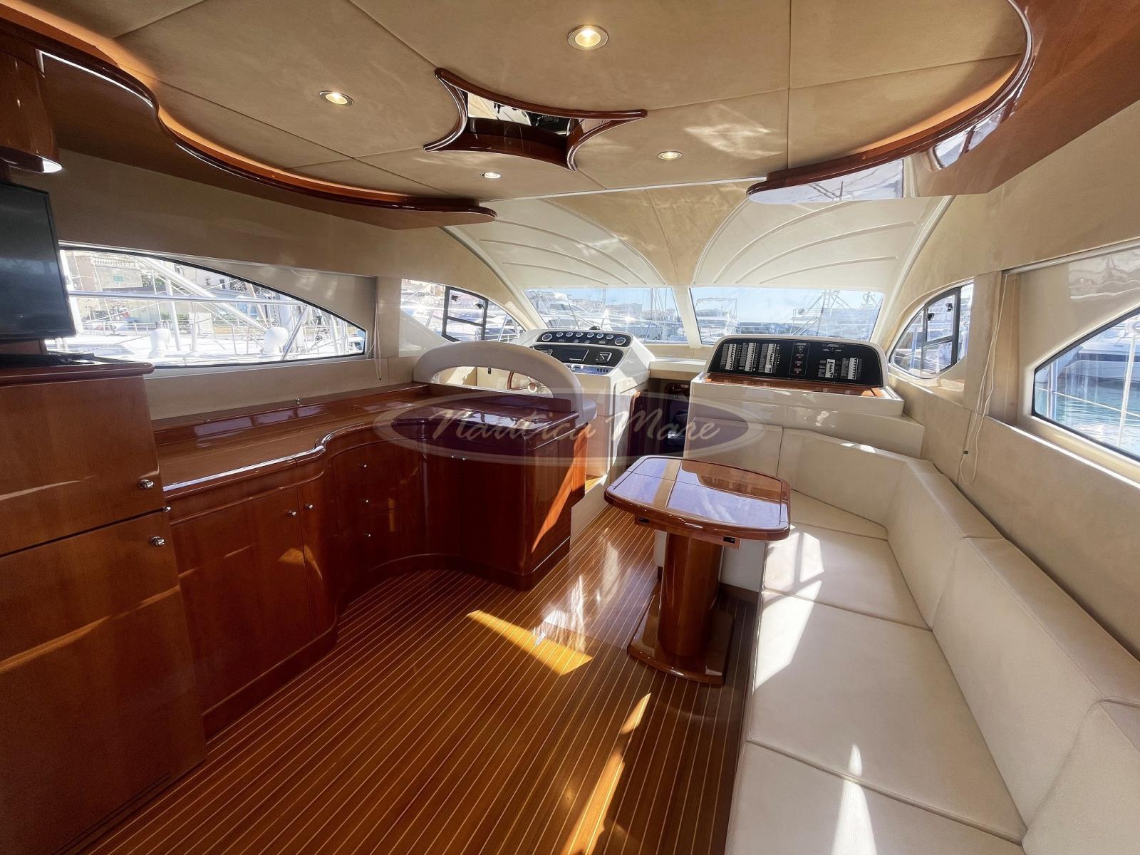 Engine Alarm, Bilge Alarm, Alternator, Water pressure pump, Folding cleats (a poppa a scomparsa con winch tonneggio lato dritto), Battery charger (Quick), Shore power cable, Guard rail, Deck Shower (nel pozzetto con miscelatore acqua c/f), Twin Steering (interna ed esterna sul fly), Stern Thruster (Quick), Bow Thruster (Quick), Directional Spotlight (di profondità sul fly), 2 Hydraulic Flaps (Bennett), Jet-Ski Crane (tramite la passerella di poppa), Fire Extinguishing System, Flaps Indicators, Washbasin in the cockpit, Courtesy Lights, Battery Monitor, Outboard engine for tender (Mercury 6 hp), Fenders, Gangway (idraulica Besenzoni, acciaio verniciato bianco e teak, lunghezza 3 mt., sollevamento 300 kg. con comando a distanza), Platform (ampia, a filo pozzetto con rivestimento in teak e doppio cancellino inox di accesso al pozzetto), Waste Water Tank Drain Pump, Automatic Bilge Pump, Manual Bilge Pump, Entry door (acciaio e vetro), Teak Cockpit (con divano e grande tavolo in teak abbattibile), Shorepower connector, Water harbor connector system, Electronic instrumentation repeater (sul fly), Rollbar (sul fly con antenne), Electric Windlass (con àncora e catena e winch di tonneggio con comando a pulsante), swimming ladder (a scomparsa nella piattaforma bagno a poppa con azionamento elettrico), Waste Water Purifier System, cockpit table (grande, abbattibile), Tender (Honda 240 cm. con scafo in vetroresina, portata 3 persone, completo di motore Mercury 6 hp), Horn, Stern Winches (lato dritto), Bow Winches (sul verricello dell'àncora).