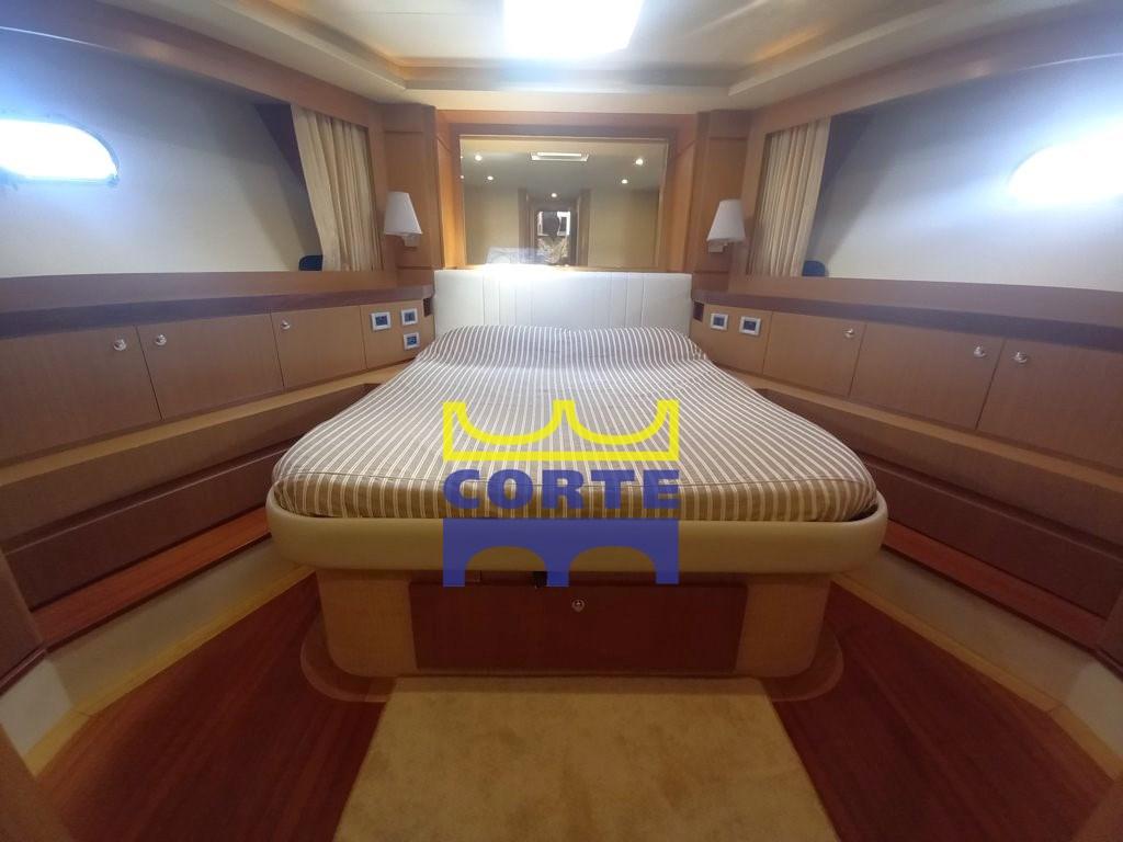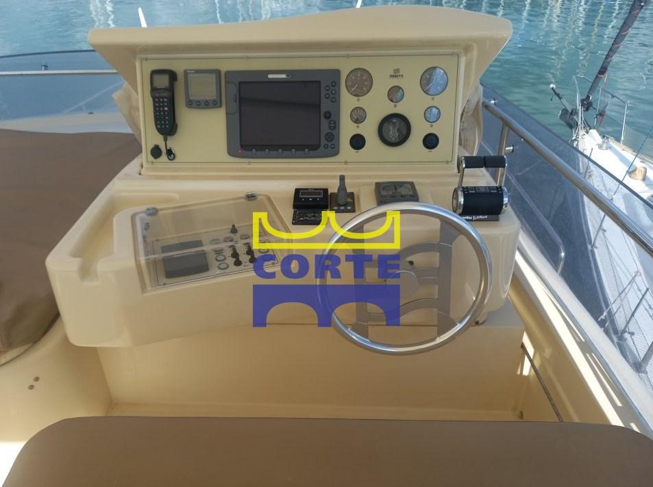 gyroscopic stabilizers, third helm station in the cockpit, teak stern platform (tender lift), telescopic table in the bow with sundeck, watertight lights under the platform, side opening of the pulpit, double Roman blinds in the saloon, side walkway light, 26" LCD TV with electric lift, drawer freezer, amplified speakers in pairs on the flybridge, empty dome, extractor hood above kitchen burners, complete deckhouse-colored external cushion covers.