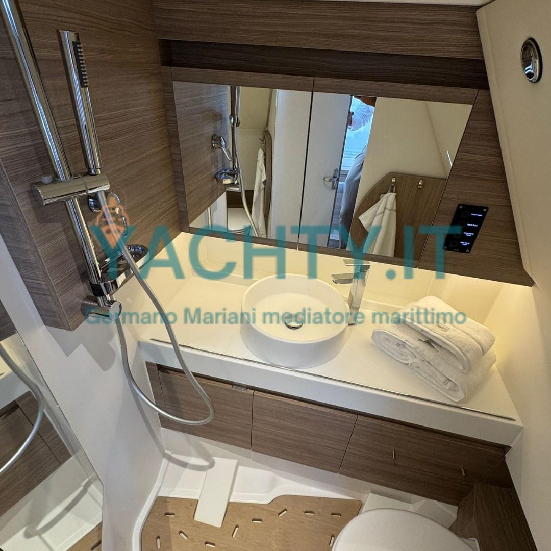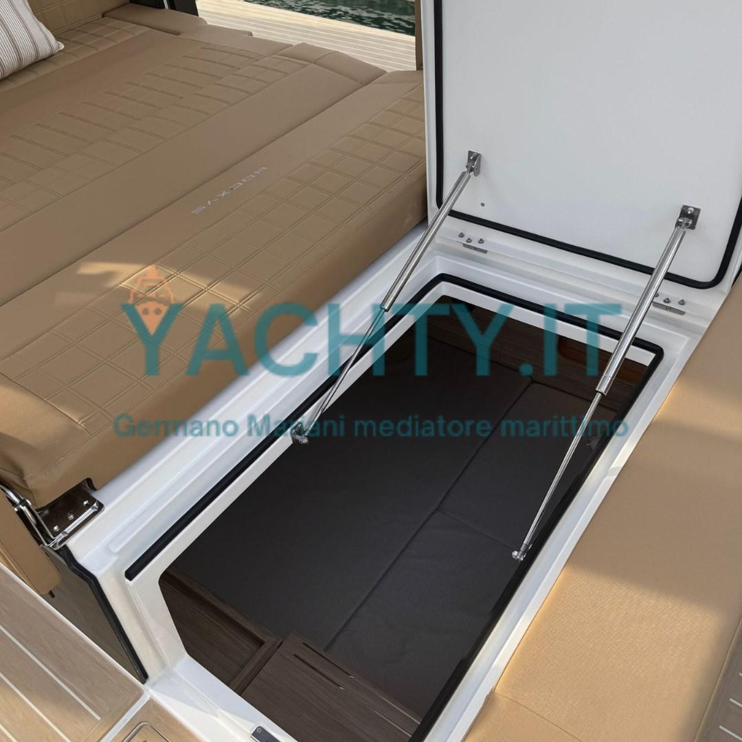 Anchor (VERRICELLO CON 16KG SS ULTRA ANCHOR ( SISTEMA DI SALPA ANCORA A SCOMPARSA )), Water pressure pump, Auto-Trim (LENCO PRO), Batteries (1X BATTERIA ELICA DI PRUA OPTIMA 1125 MCA,2X STARTER OPTIMA 1000 MCA, 2X DOMESTIC 140AH GEL), Deck Shower, Courtesy Lights (LUCI DI COPERTA, LUCI HARD TOP, N.2 LUCI A SCOMPARSA NEL MOBILE BAR), Underwater lights, Entry door, Teak Cockpit, Shorepower connector (SISTEMA MASTERVOLT SHOREPOWER CON CARICABATTERIA DA 100AM, CAVO ALIMENTAZIONE BANCHINA DA 15M), swimming ladder, cockpit table, Living Room Foldable Table (TAVOLO PIEGHEVOLE BAINCO LUCIDO CON GAMBA ELETTRICA INCLUSO COPRITAVOLO), Horn.