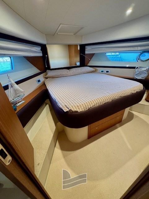 The full-beam master cabin has a private bathroom and a large wardrobe. The inclusion of the two large open-view windows with opening portholes are an important milestone in the optimization of space and equates the 530 with considerably larger boats.