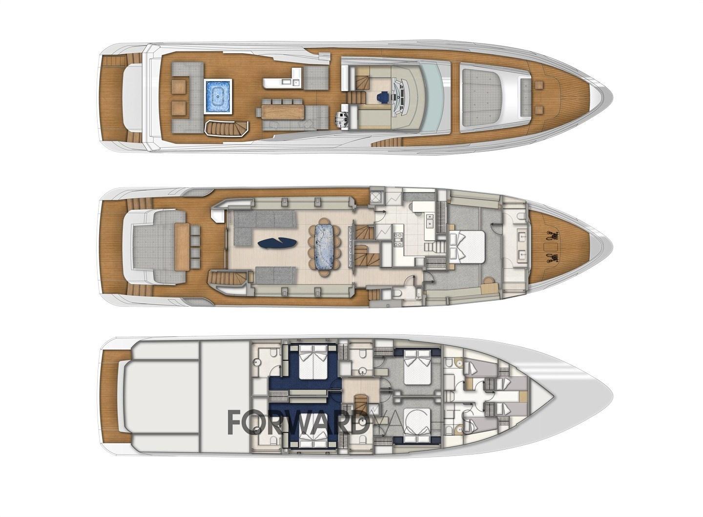 The boat combines elegance and cutting-edge technology. It can accommodate up to 10 guests in 5 spacious cabins: an owner's suite on the main deck and, below deck, two double VIP cabins and two twin cabins with convertible flat beds; all with ensuite bathroom. In the bow, the crew area can accommodate up to 5 people.