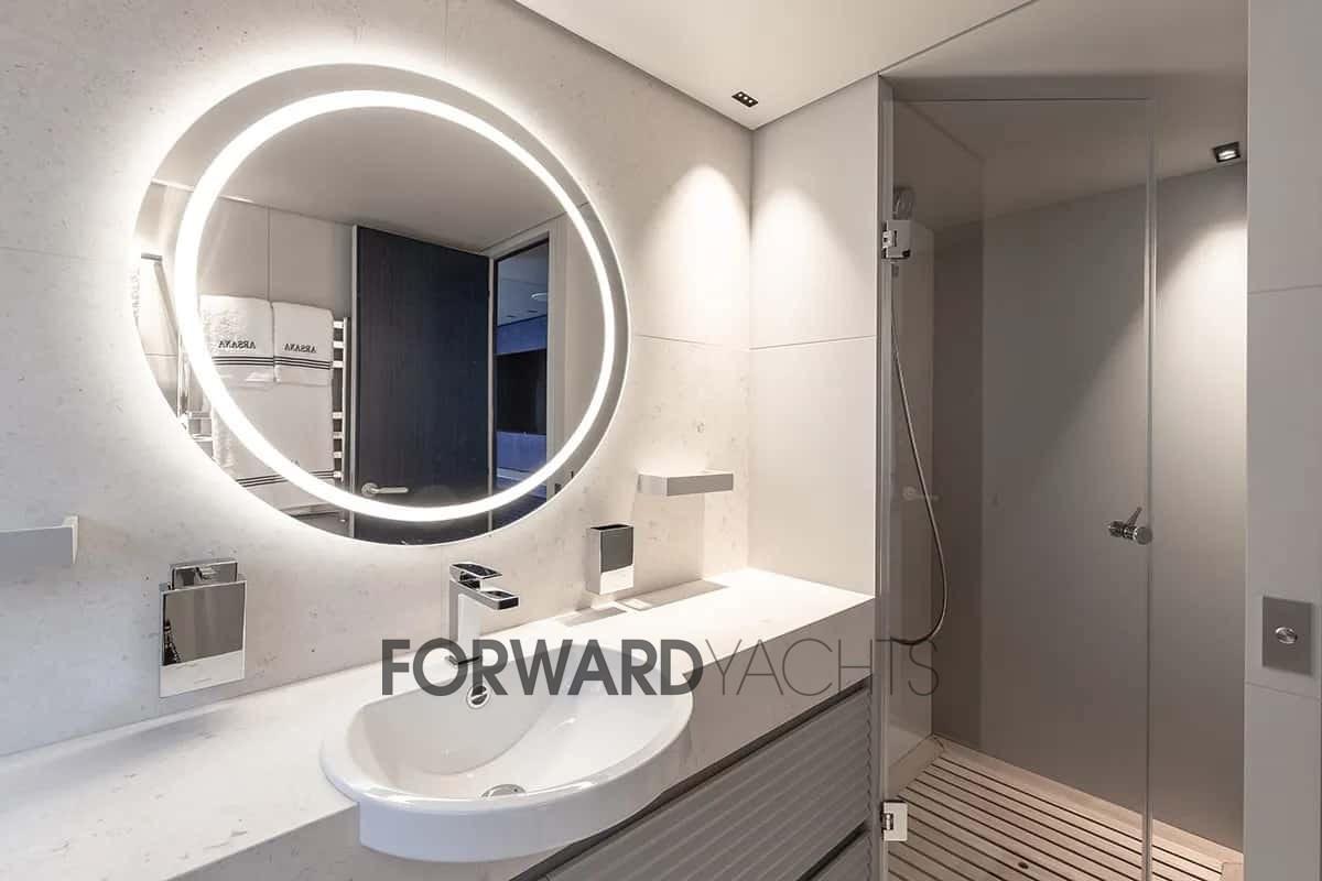 This superyacht in particular has a bright and comfortable saloon with panoramic windows and large outdoor spaces. The fly bridge is complete with a dining table, sundeck and jacuzzi. Equipped with 4 1,200Hp Volvo Penta IPS engines, for a maximum speed of 27 knots and comfortable navigation at 23 knots, ensuring exceptional efficiency, low fuel consumption and manoeuvrability.