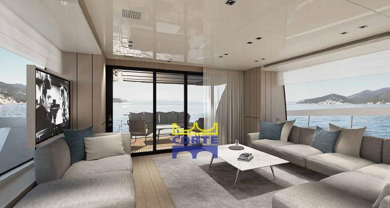 The separation between external and internal area is not perceived, from the aft area there is a large living room with Flexform sofa and parquet floor.