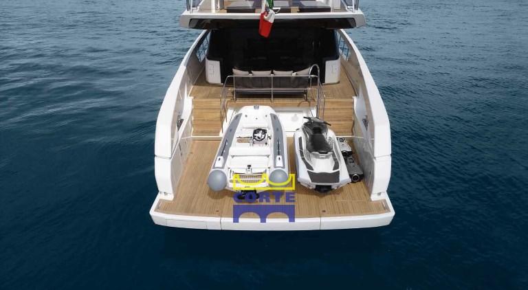 Raymarine diamond navigation package, watertight sockets, 4G wi-Fi, closed circuit TV. teak fly floor, Wi Fi system, fly side windows that can be opened electically, fly air conditioning, central beach area platform with electric movement, activated carbon filter for fresh water, dinette table with manual ups and downs, fly table with electric ups and downs, 2nd 28 kw generator, hob on the flybridge, modification of crew area with appliances moving, lower deck corridor parquet, Electric saloon curtains and master cabins, additional cabinet on the flybridge.
