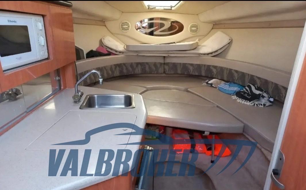 Versatile cruiser cabin cruiser, appreciated for its ability to combine the performance of a sports boat with the comfort of a family boat. It includes a functional kitchen and a separate bathroom with marine toilet and sink.