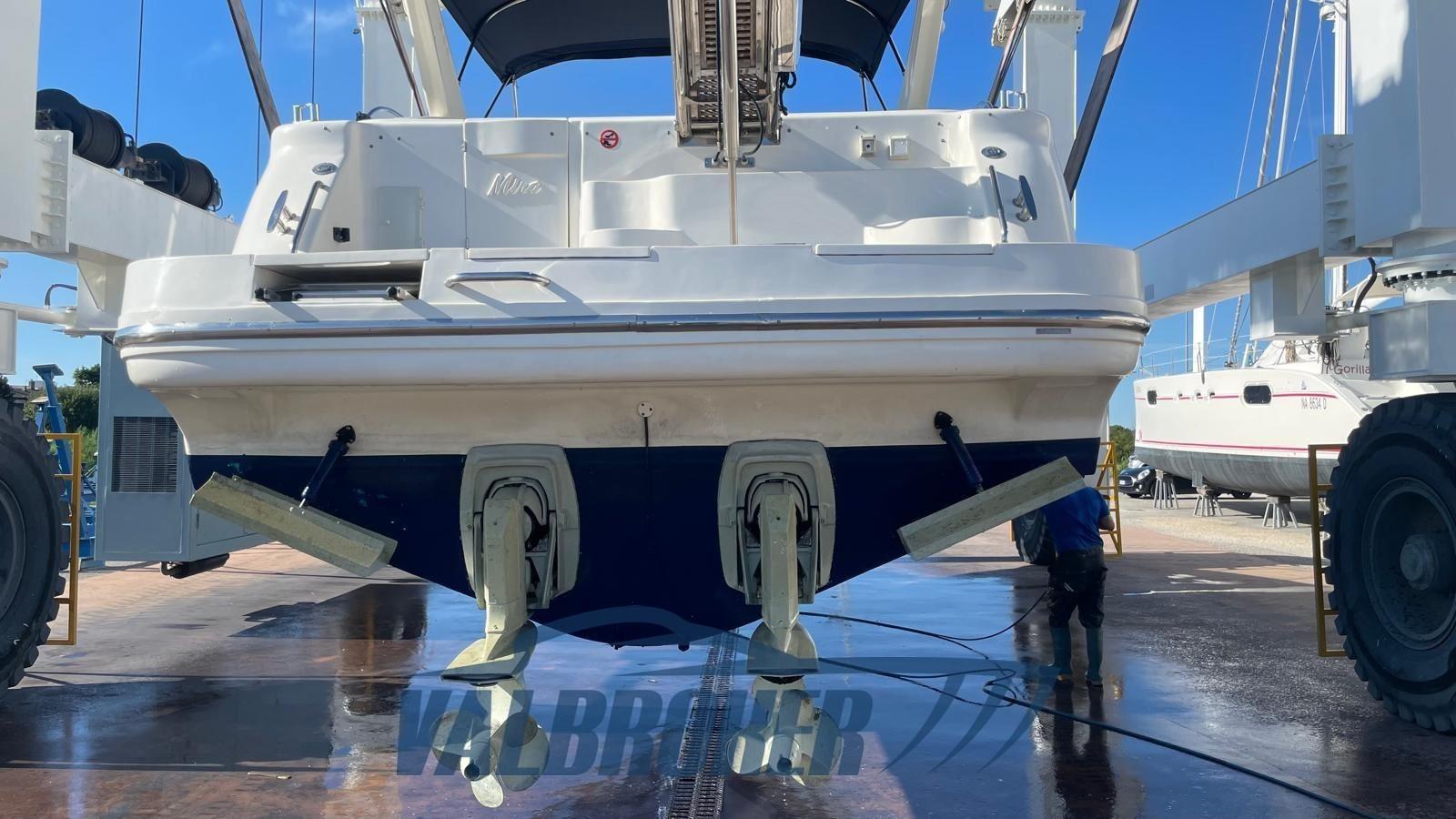 2022: the engines were landed and overhauled: turbines, exchangers and risers. 2024: new owner's bath pump, refitting of control panels, complete polishing. 2025: new awnings, power steering tubes, racor filters, trim relays, diesel hoses. 2026: Complete engine and transmission service. Antifouling transmissions and hull.