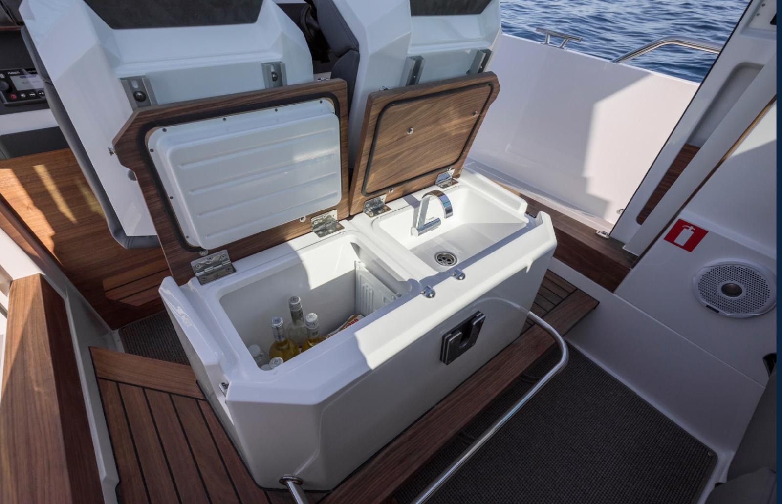 Engine Alarm, Water pressure pump, Special Colour (Grey Hull), Deck Shower, Directional Spotlight, Courtesy Lights, Teak Cockpit, Shorepower connector, Electric Windlass, Stabilizers (Quick), cockpit table.