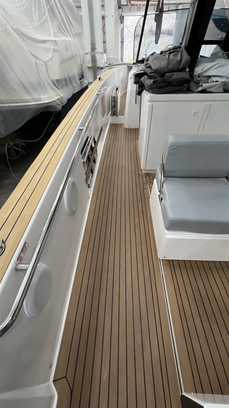 Engine Alarm, Water pressure pump, Teak Side Decks, Special Colour (Grey Hull), Deck Shower, Fire Extinguishing System, Washbasin in the cockpit, Courtesy Lights, Gangway, Teak Cockpit, Electric Windlass, swimming ladder, cockpit table, T-Top.