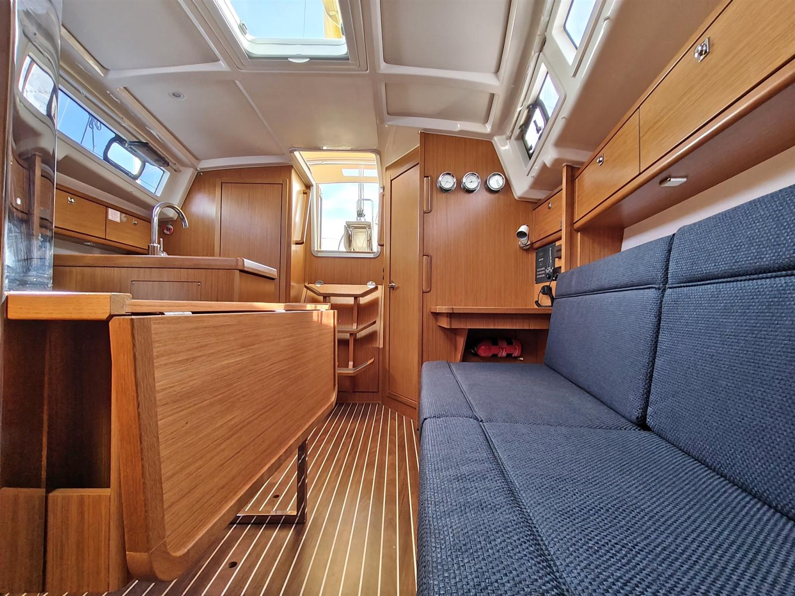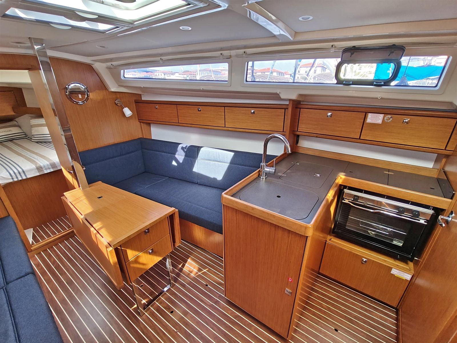 L-shaped galley complete with sink, hob with 2 gas burners, tilting oven and cockpit refrigerator