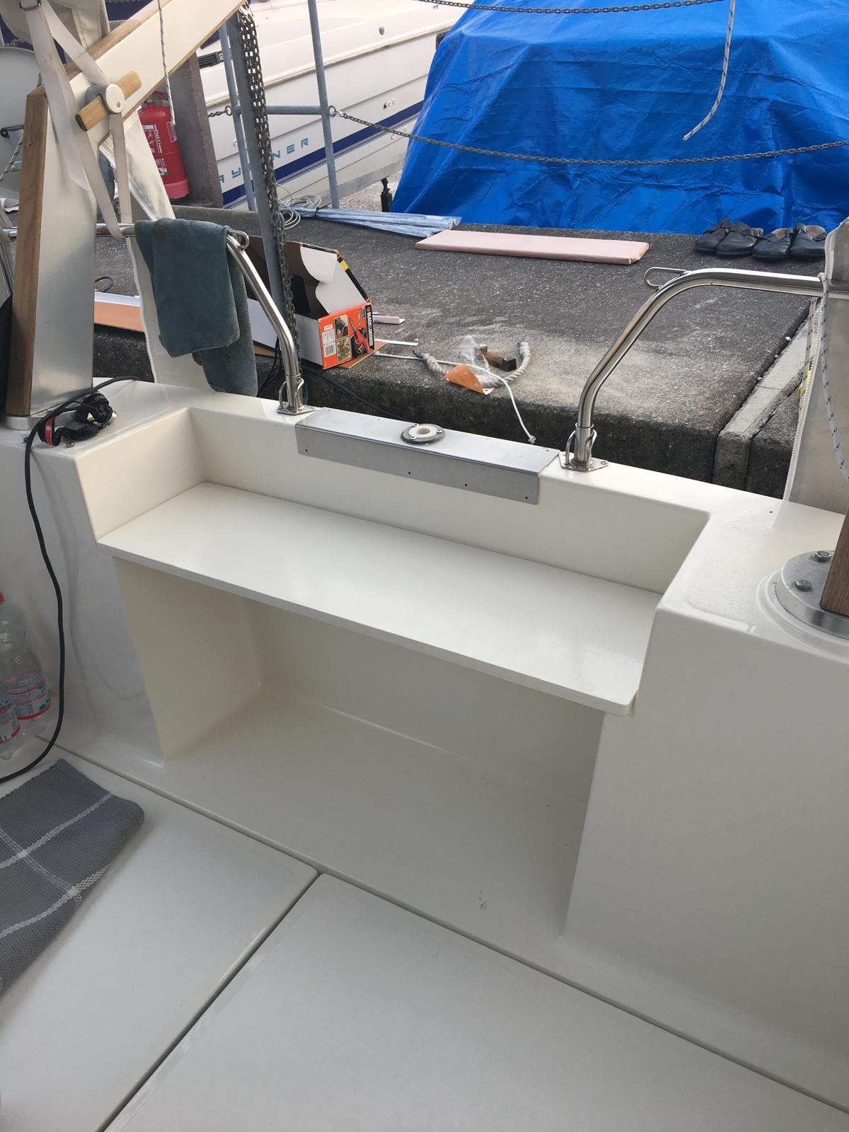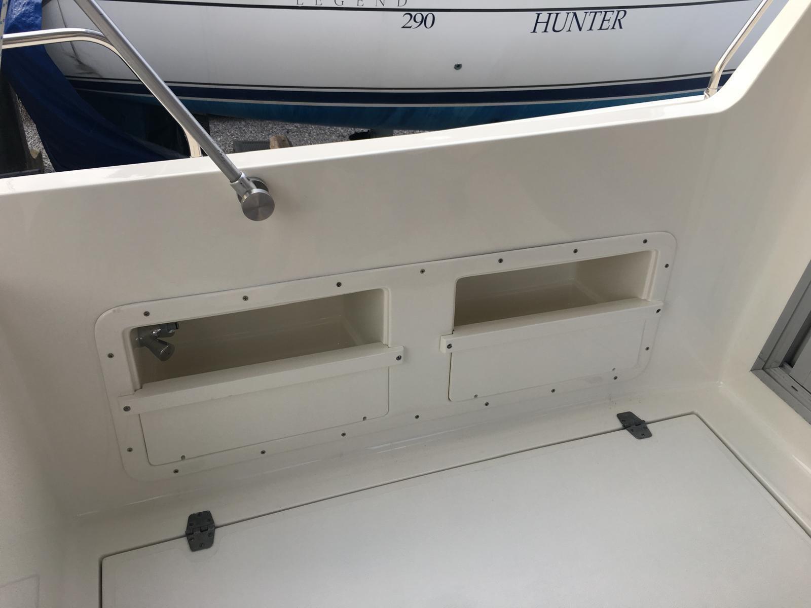 Self-draining cockpit, Life buoy, Gas locker with drain.