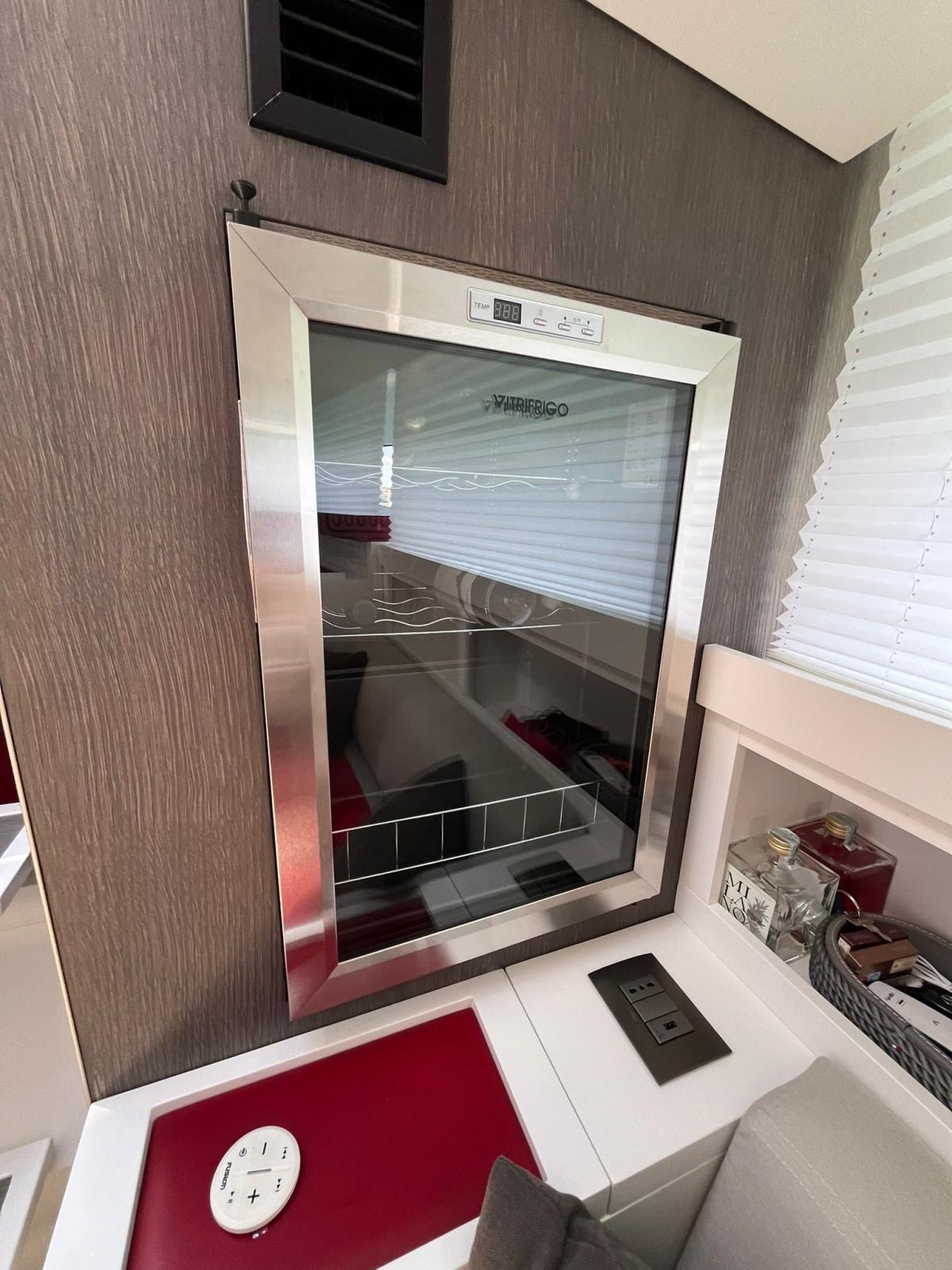Air conditioning - Mase 7 kW generator set - inverter - electric bow thruster - retractable stainless steel anchor - 1500 W inverter - Zipwake flap - Fusion stereo - electro-hydraulic stern platform - courtesy lights - underwater lights - wine cellar - ice maker - fridge - freezer - electric hob - grill - Estech synthetic teak - TV antenna - LCD TV - Elka shower with carbon rod at the stern - electric awning for stern - T-top - hull wrap.