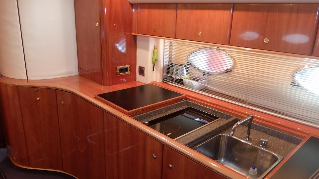 Electric bow thruster - hot/cold air conditioning - Onan 12 kW generator set - tender garage - Williams 280 waterjet tender - double bathing ladder - Opacmare electro-hydraulic gangway - underwater lights - microwave - 2-burner electric hob - fridge/freezer - cockpit bar cabinet with sink, grill and fridge - TV antenna - LCD TV - oversized stern bridge as V55.
