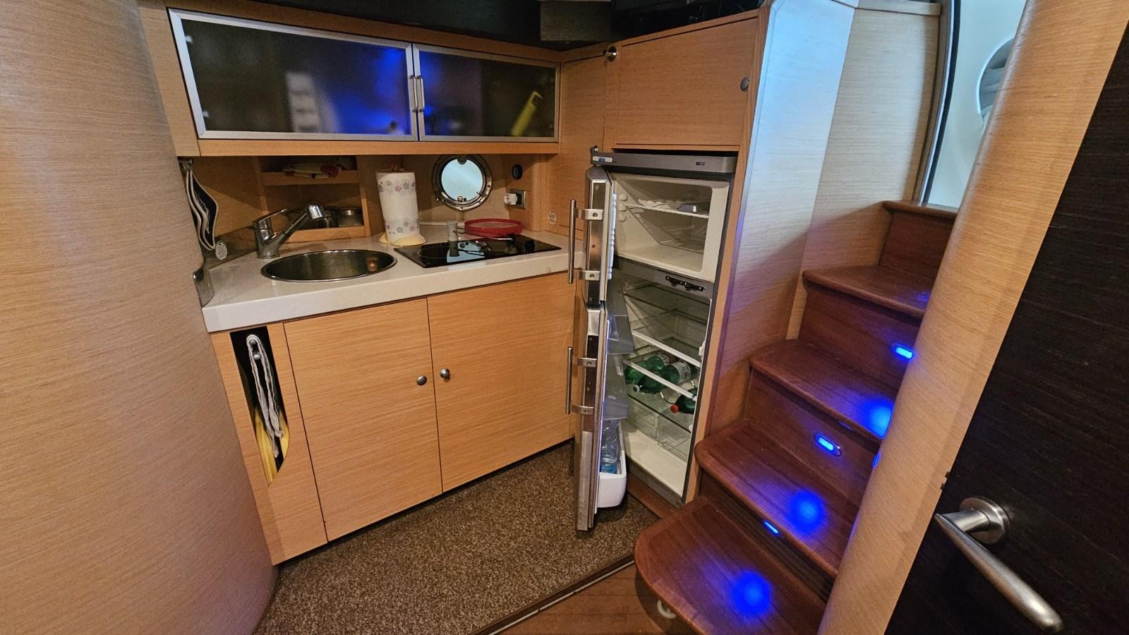 Electric hard top - cockpit bar cabinet with sink, fridge and grill - electric cockpit table that can be converted into a sundeck - electro-hydraulic engine hatch - stern awning for total closure of the cockpit - electric two-burner hob - fridge - freezer - LCD TV in the two cabins and in the cockpit - SAT TV antenna - electro-hydraulic gangway - air conditioning - Fisher Panda 5 kW generator.