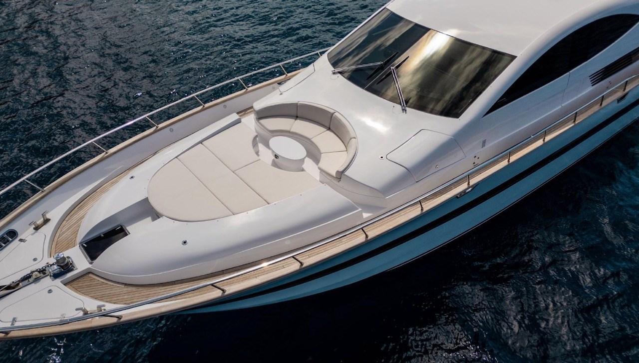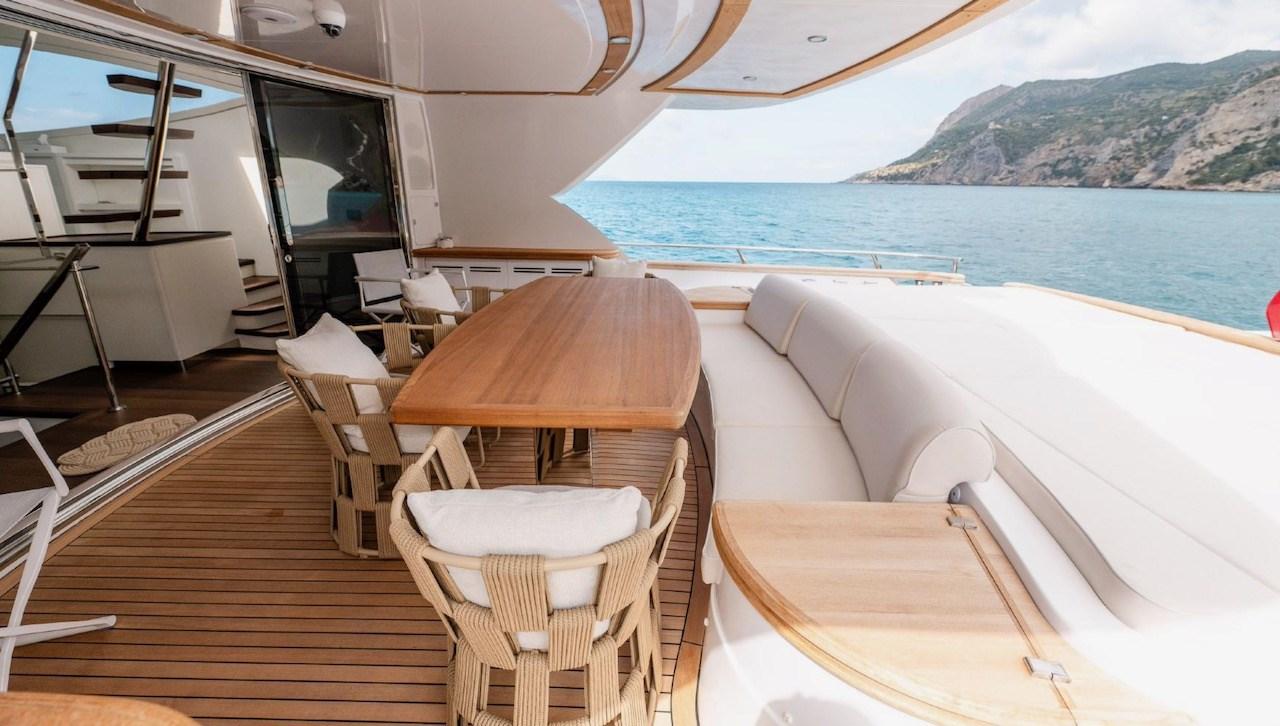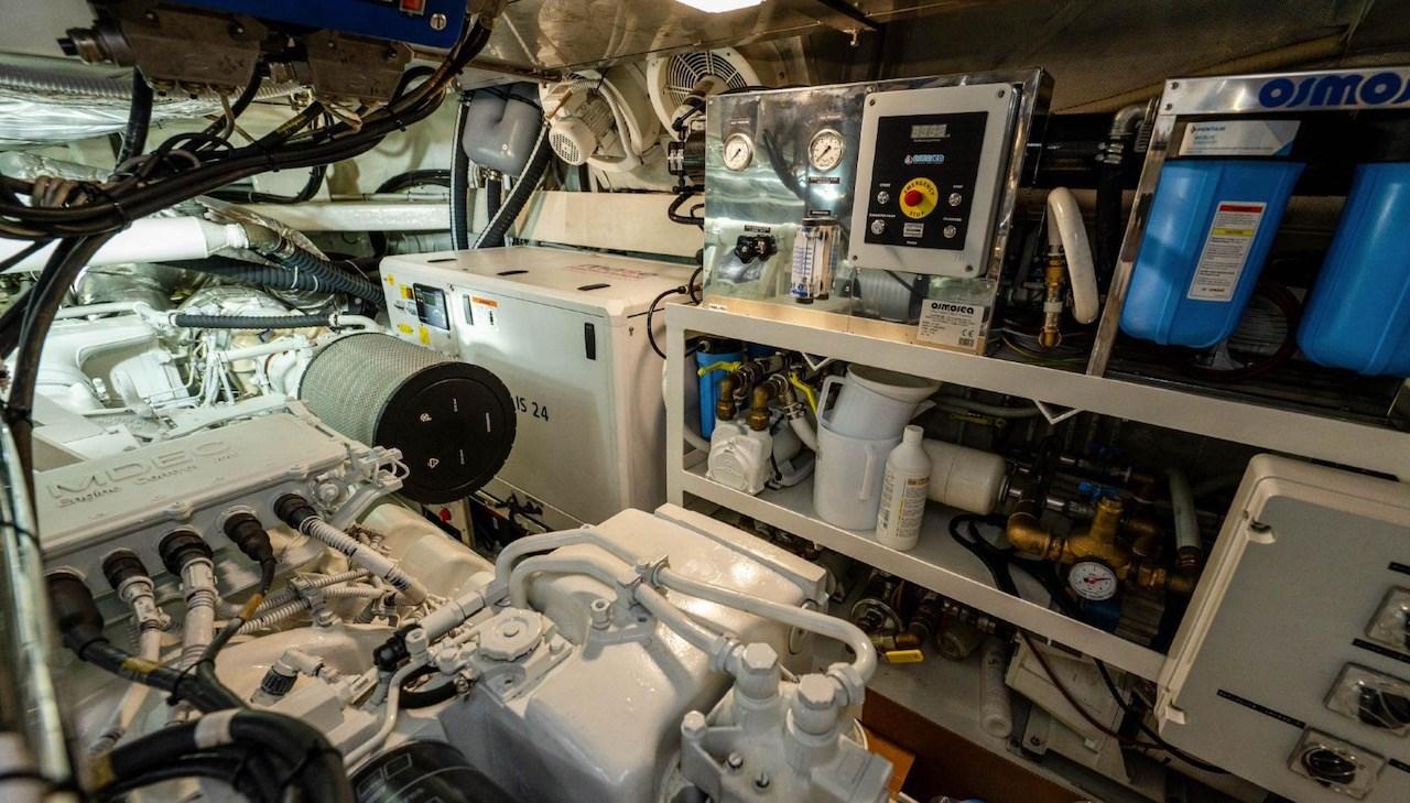 Engine Alarm, Bilge Alarm, Water pressure pump, Draining System, Teak Side Decks, Deck Shower, Twin Steering, Hydraulic Flaps, Tender Crane, Fire Extinguishing System, Flaps Indicators, Courtesy Lights, Underwater lights, Gangway, Platform, Entry door, Side door, Teak Cockpit, Shorepower connector, Water harbor connector system, Voltage Rectifier, Rollbar, Electric Windlass, swimming ladder, Saddles for tender, cockpit table, Tender, guard rails with gates, Horn, Stern Winches, Bow Winches.