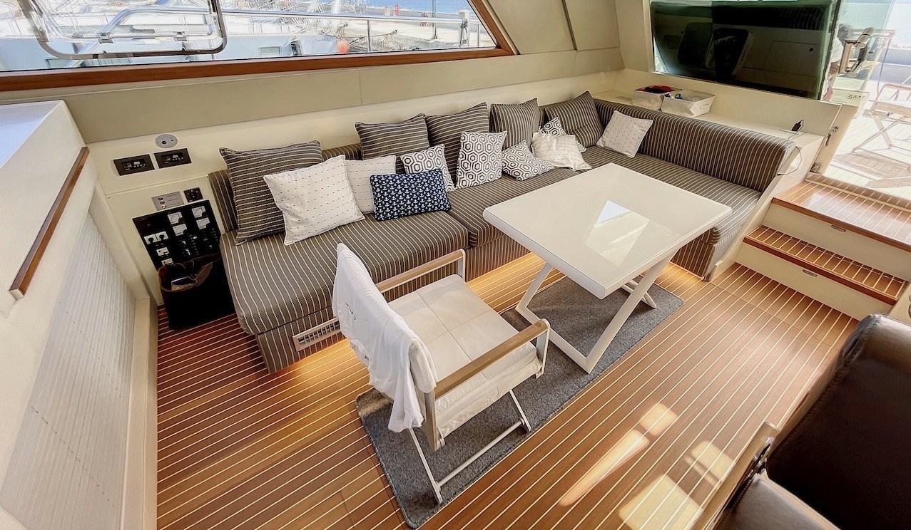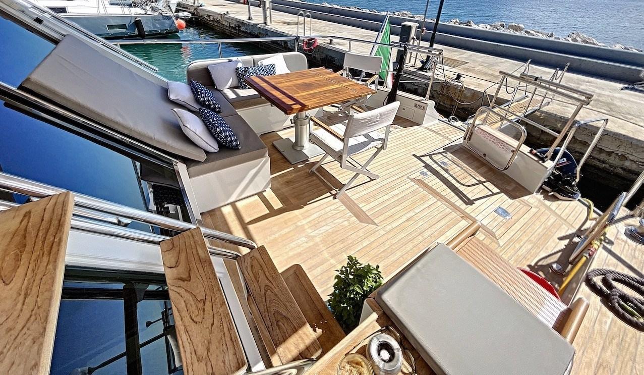 Engine Alarm, Bilge Alarm, Water pressure pump, Draining System, Deck Shower, Hydraulic Flaps, cradle, Courtesy Lights, Gangway (elettroidaulica), Platform, Entry door, Teak Cockpit, Shorepower connector, Water harbor connector system, Electric Windlass, swimming ladder, Saddles for tender, cockpit table, Tender (con fuoribordo), Horn, Stern Winches.