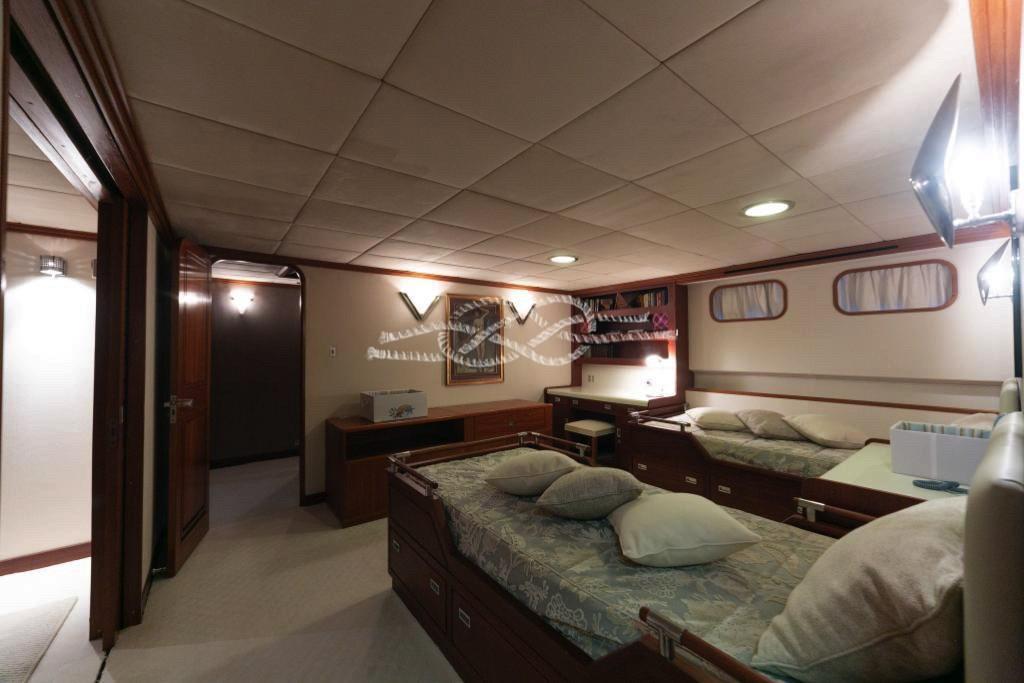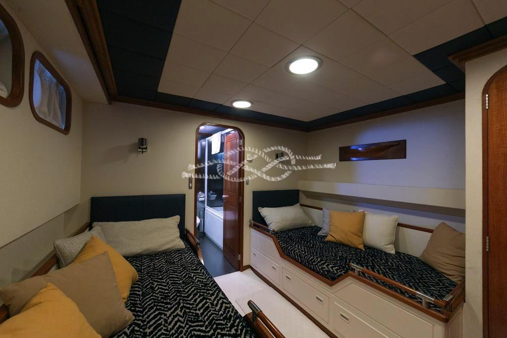 Master cabin on the main deck with double bed and bathroom - VIP cabin with two beds and bathroom - guest cabin with two flat beds and bathroom - guest cabin with two flat beds and bathroom.
