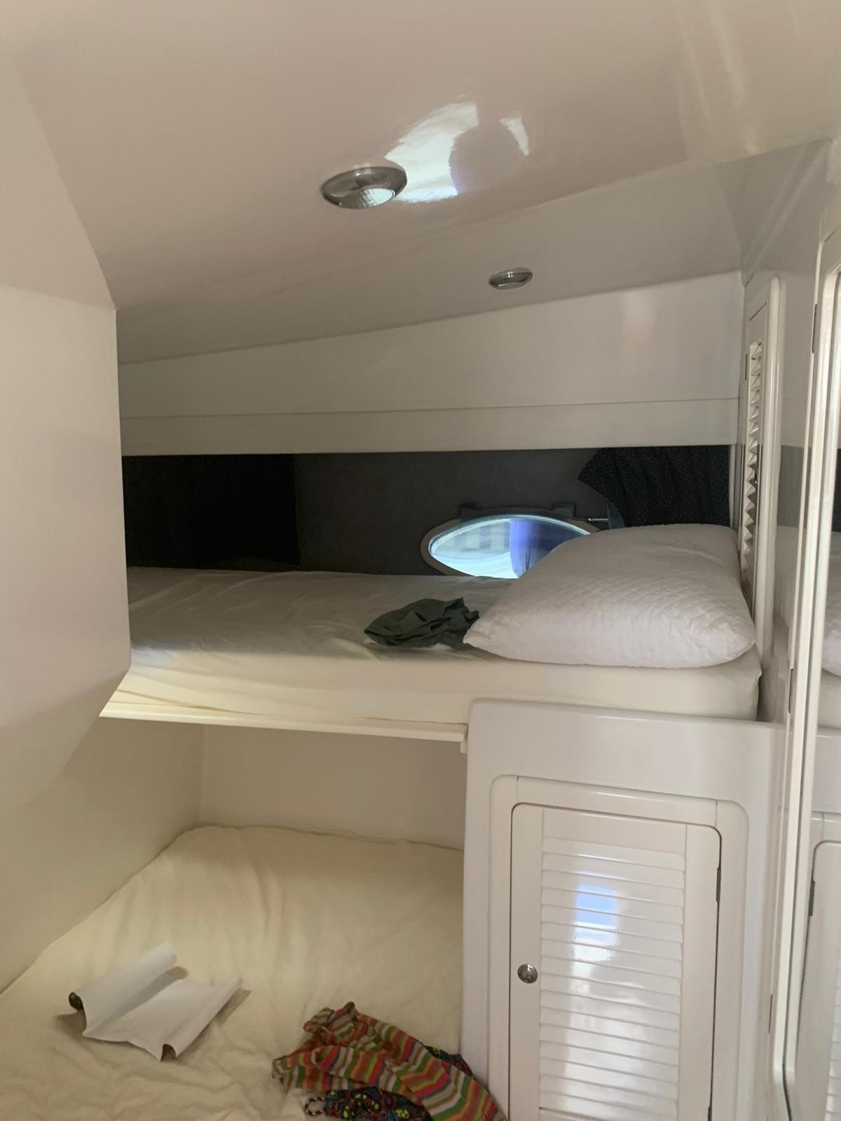 Master cabin with double bed - guest cabin with two crossed beds - bathroom.