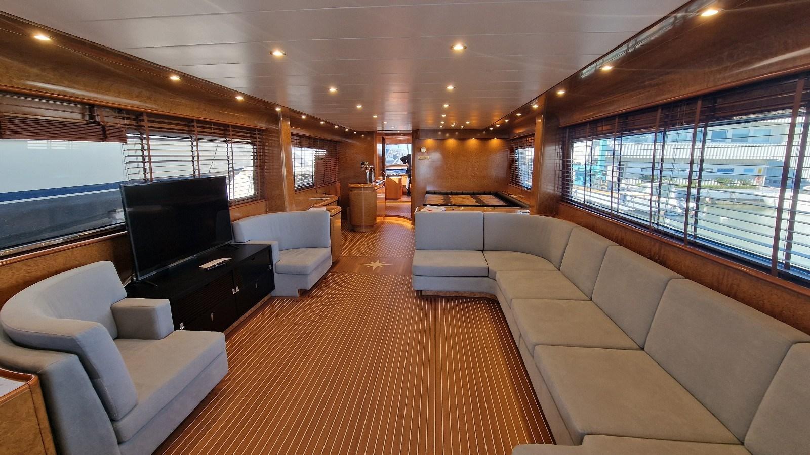 Boat that has just completed a total refit (painting, electrical system, hull at zero, replacement of engines with no. 2 CAT of 1,670 hp each, stabilizer fins, tender lift with oversized aft platform, stern rebuilt with ladders, etc.).